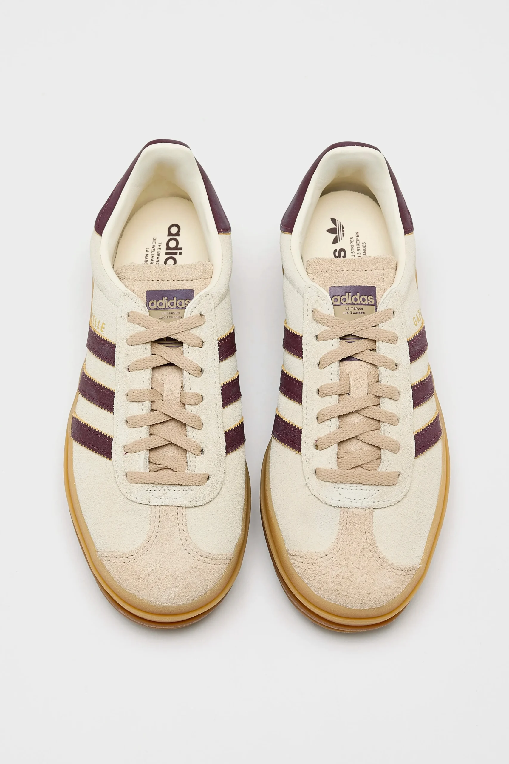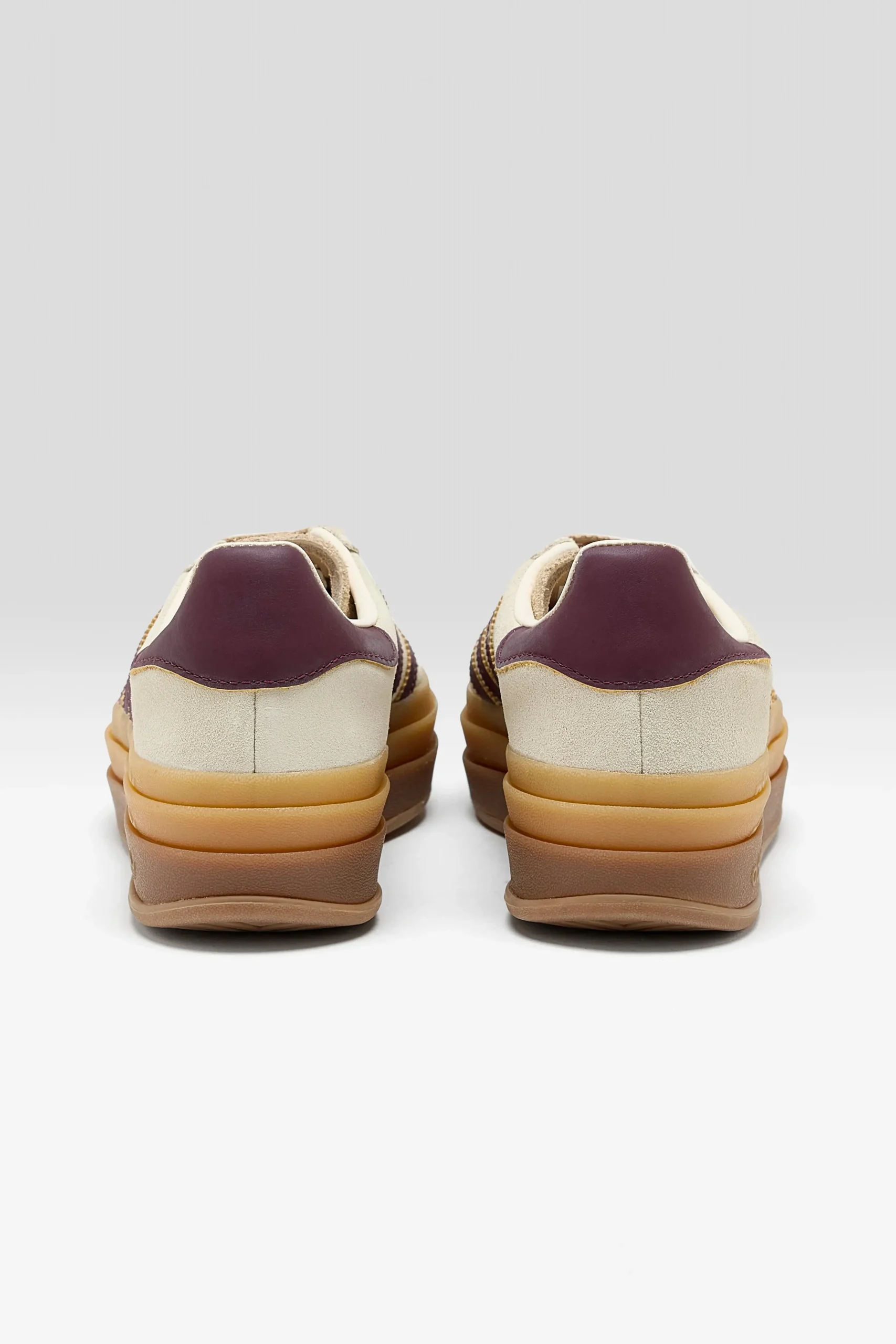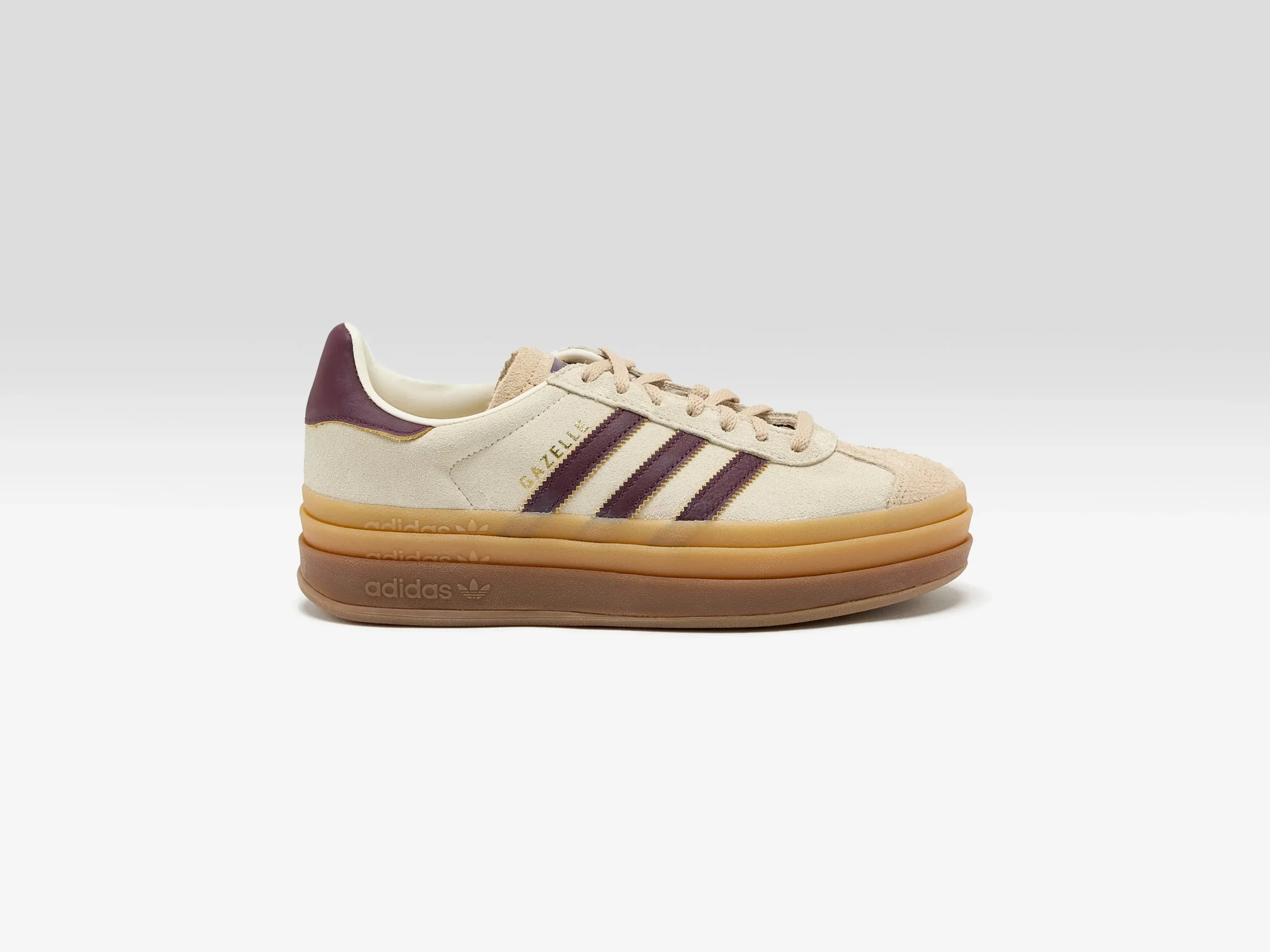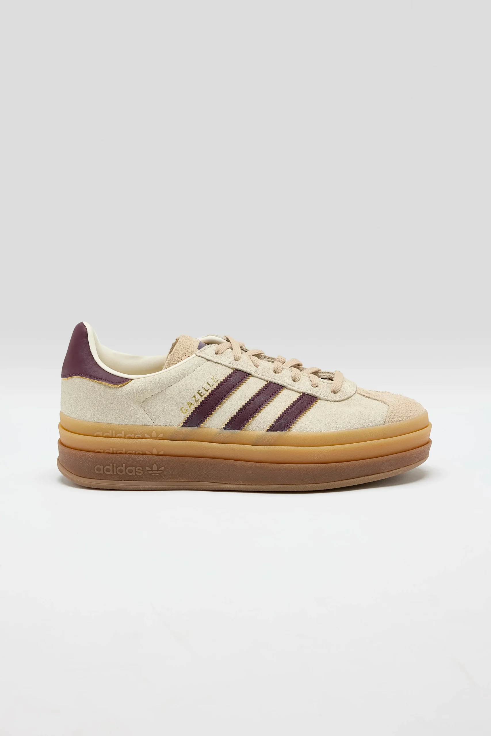 The Adidas Gazelle Bold sneakers feature a suede upper with brand details on a chunky gum rubber outsole.