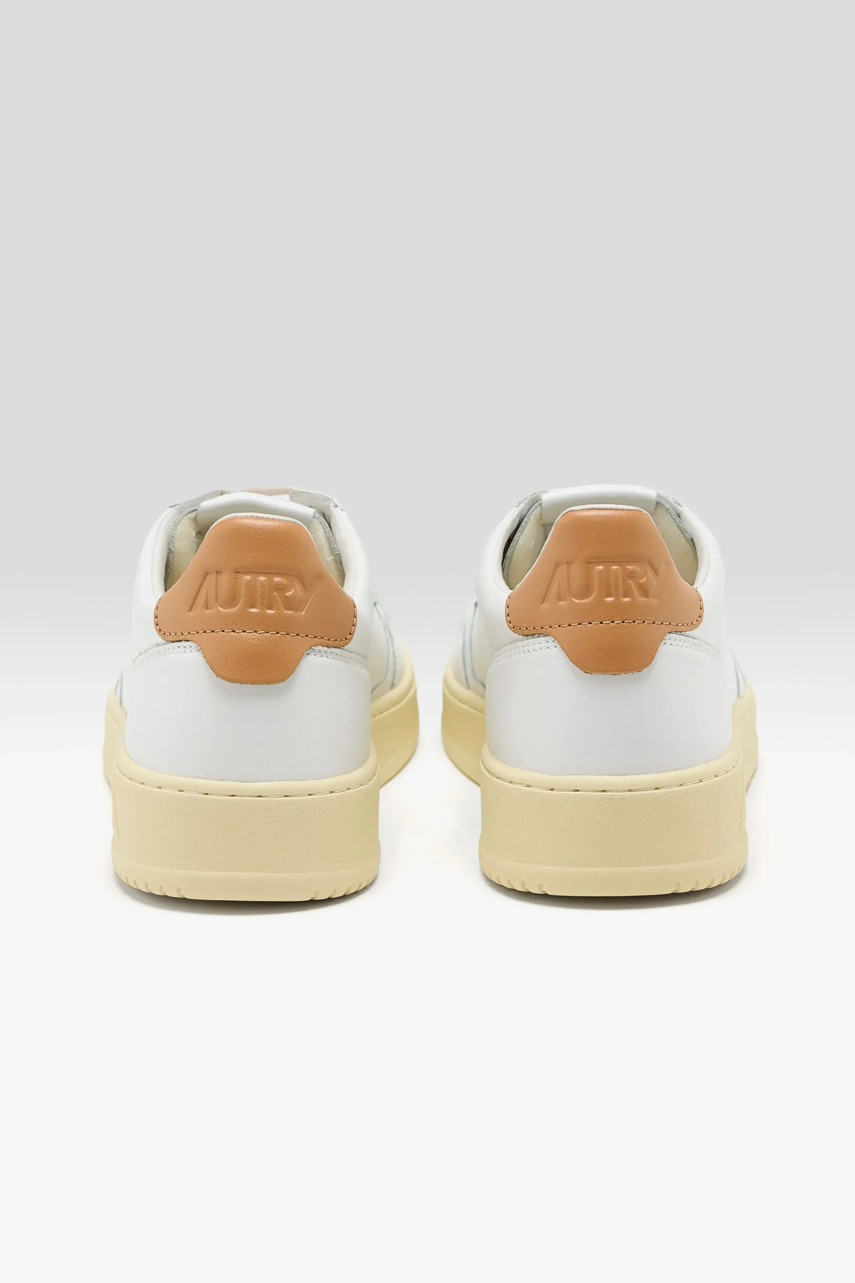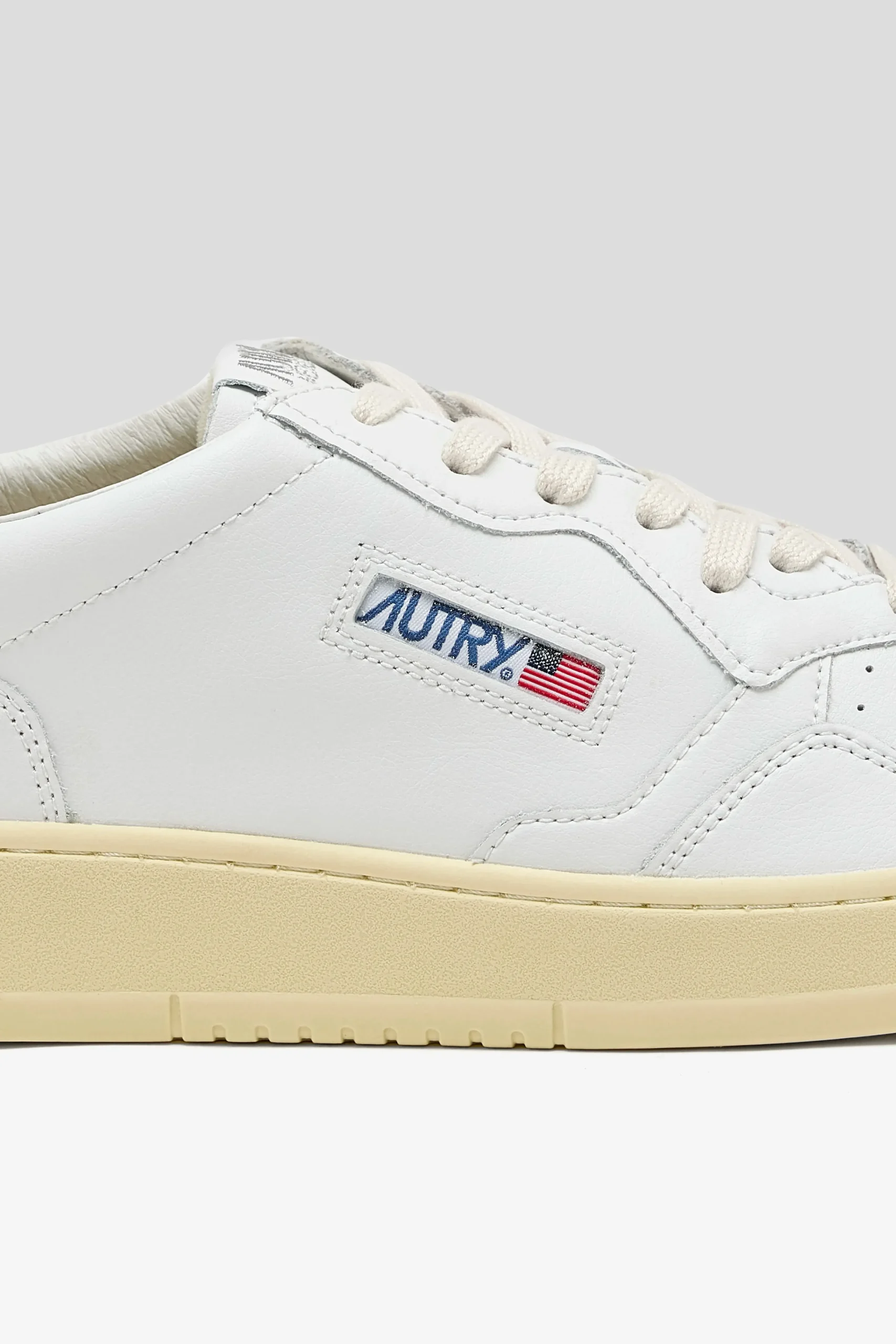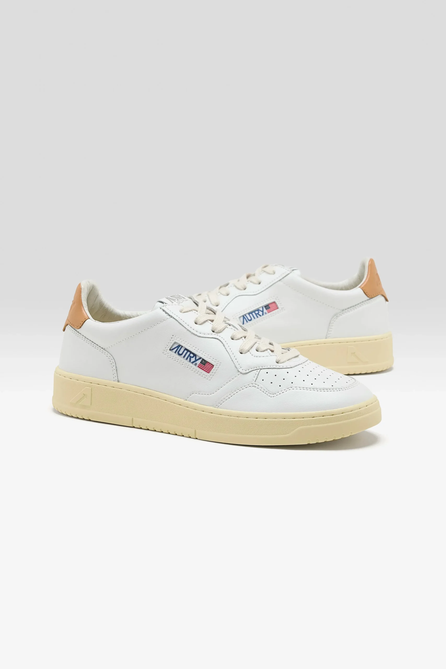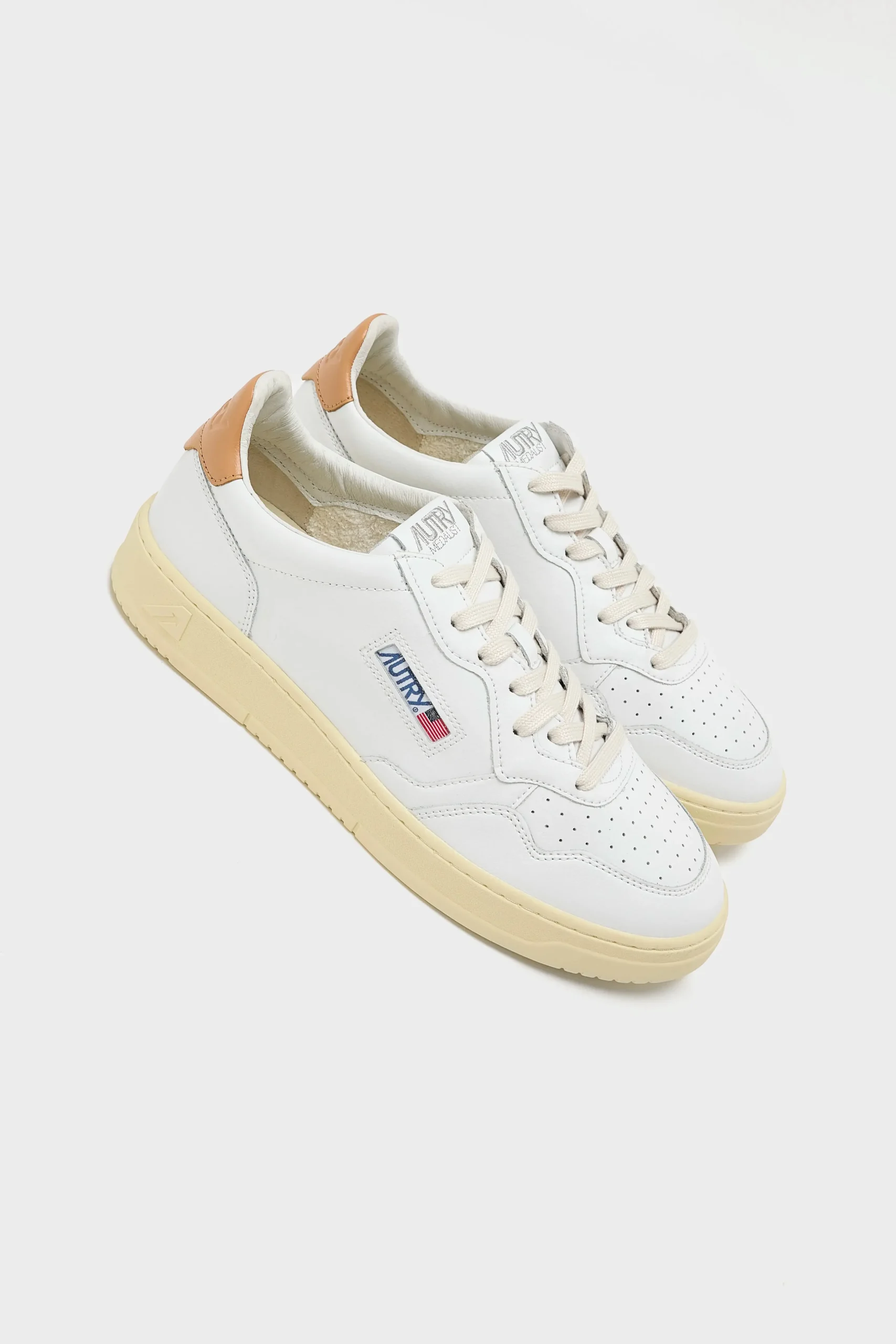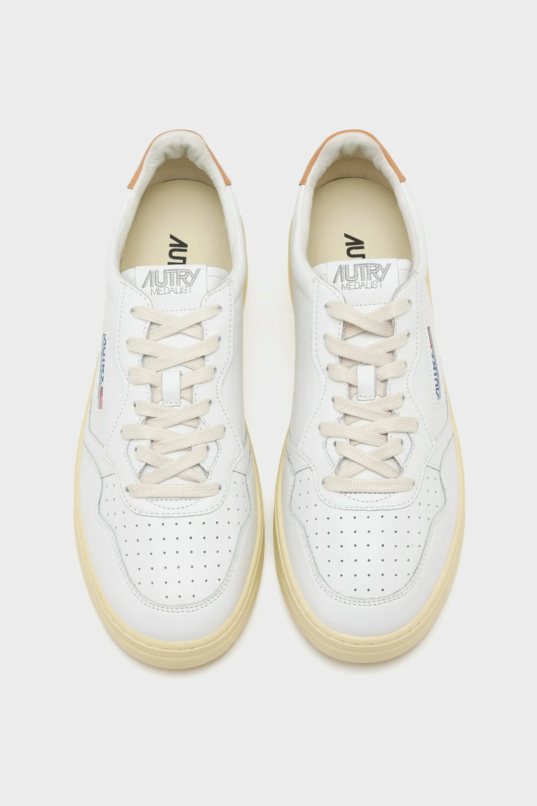 The Autry Medalist Low features a white leather upper, a perforated toe box, and a Sandstorm padded leather ankle collar.