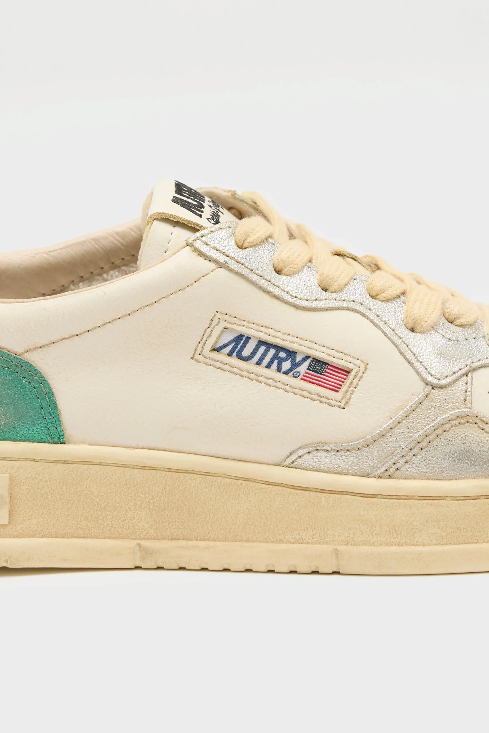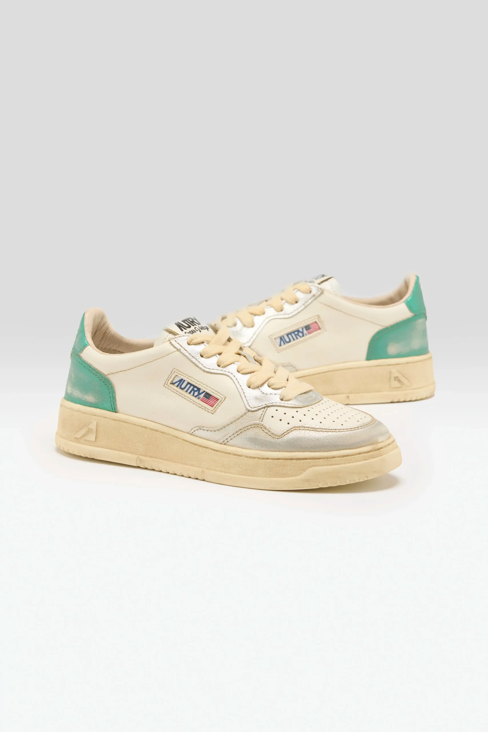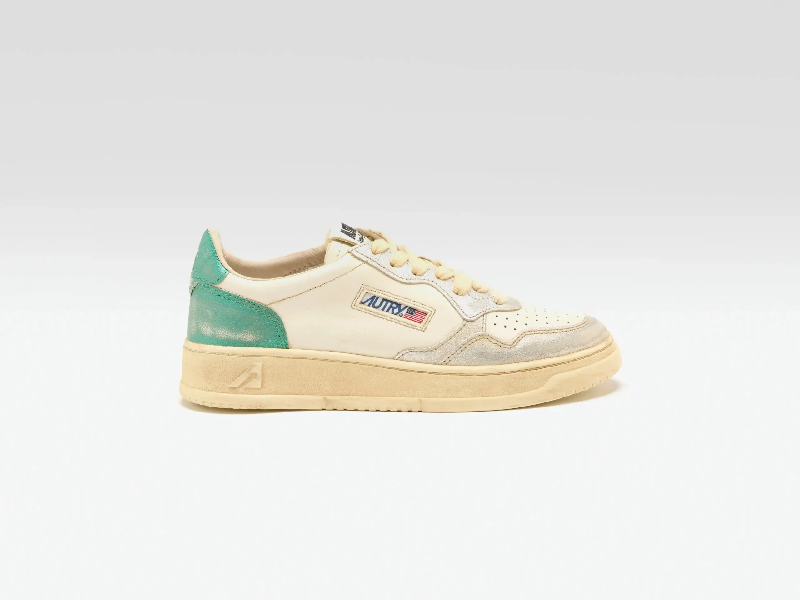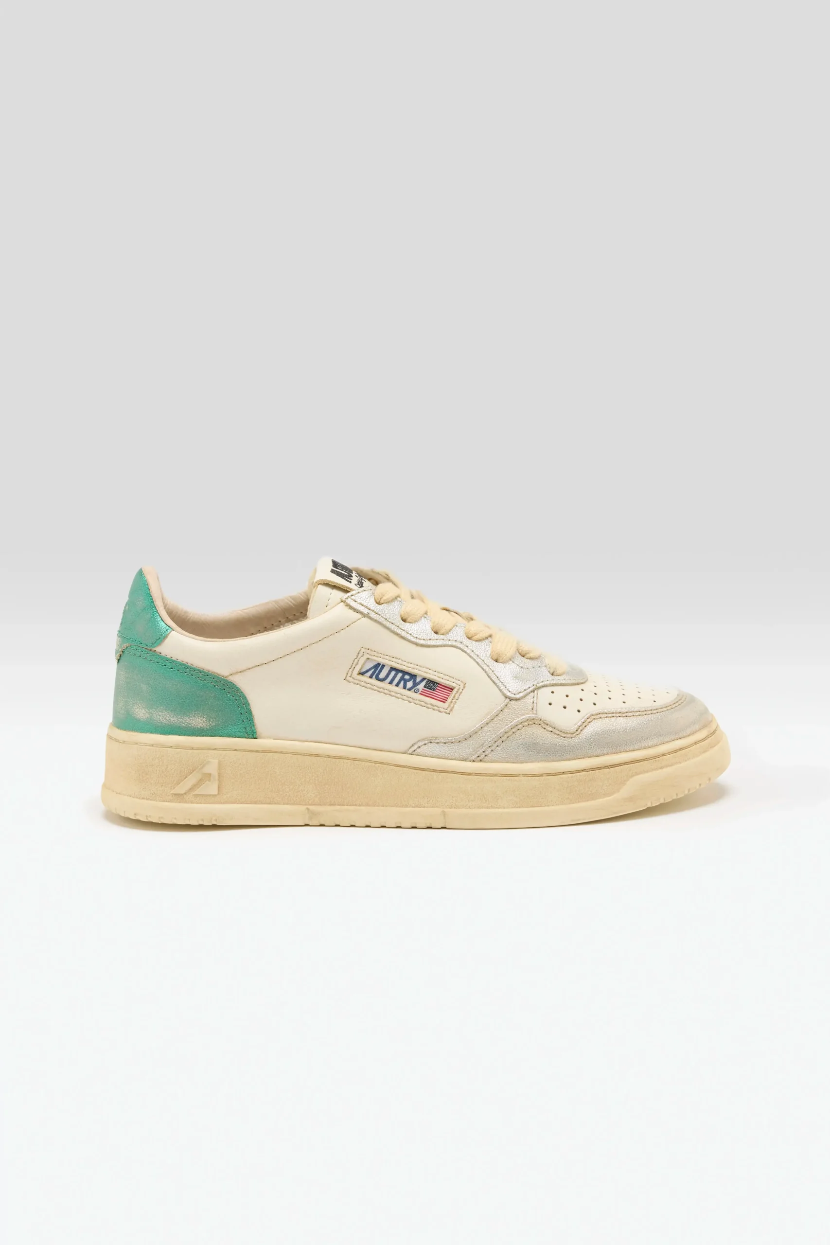 The Autry Medalist Low Super Vintage tennis-inspired sneakers feature a soft leather upper enhanced by artisanal treatments, creating a used, irregular, and unique look.