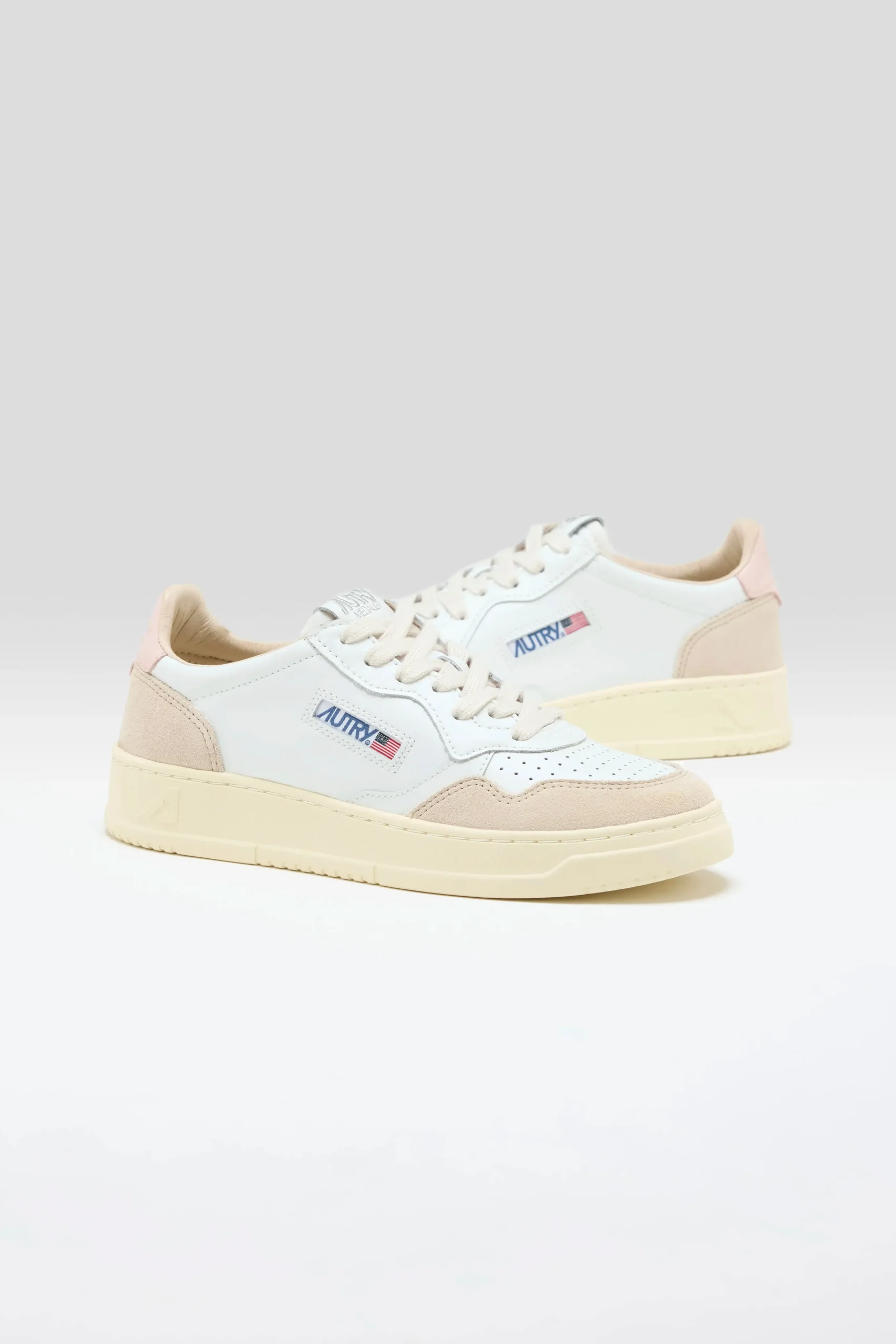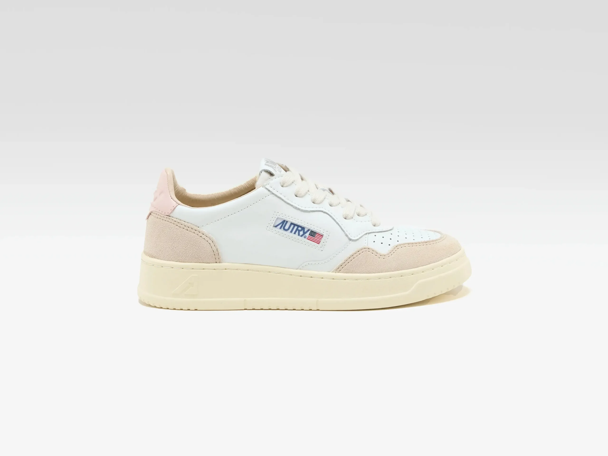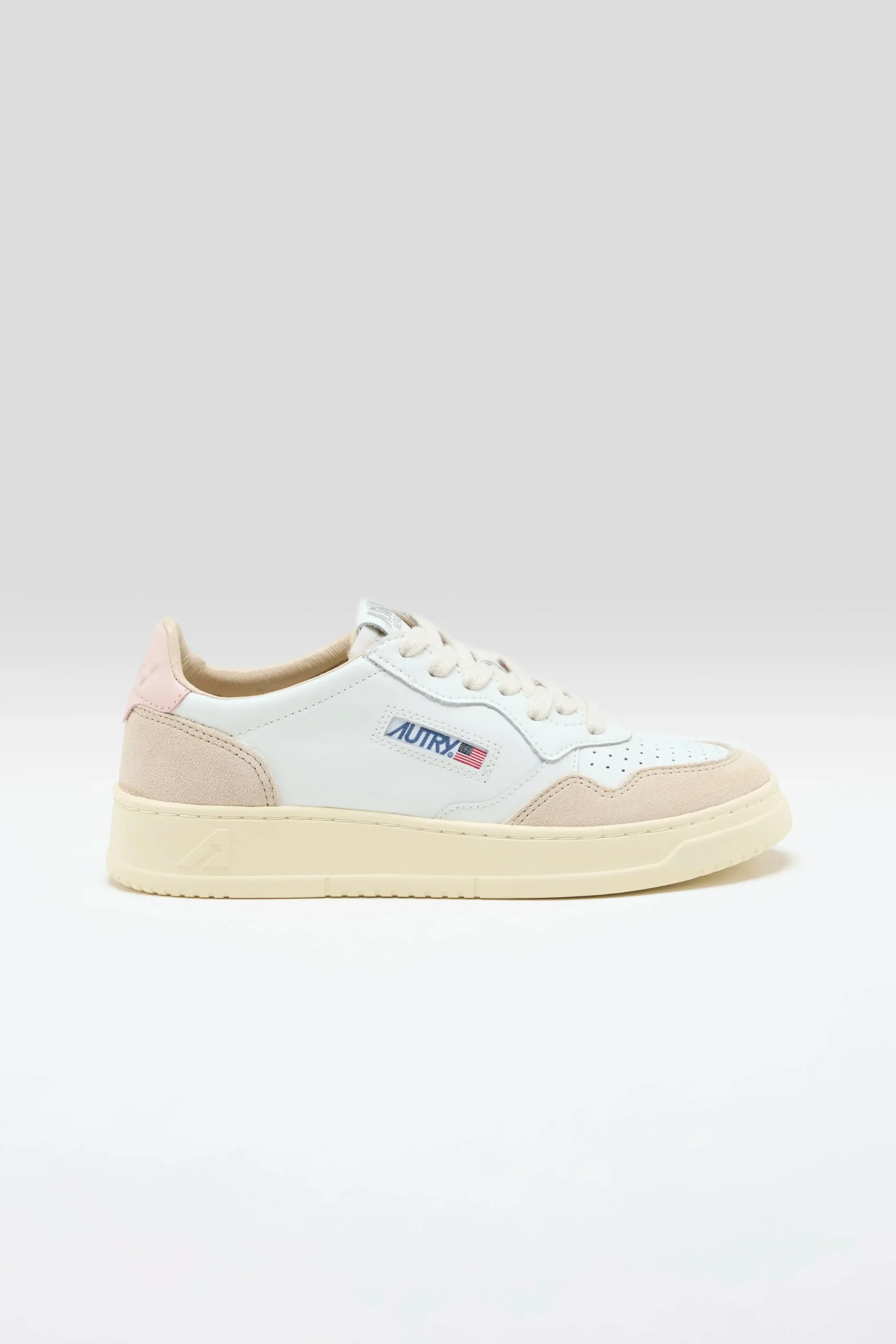 The Autry Medalist Low sneaker features a natural, supple white leather upper with beige suede panels and pink leather heel tab