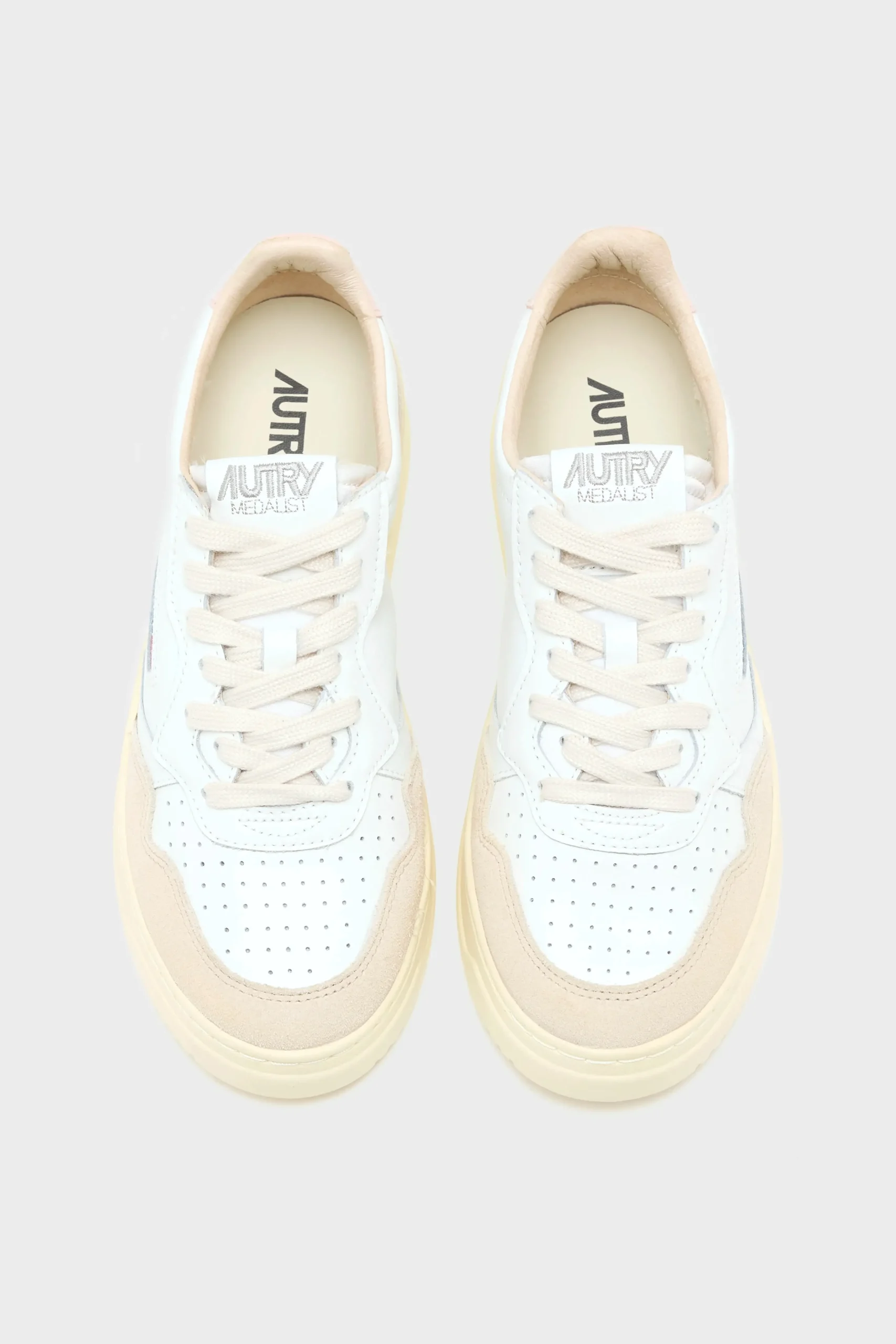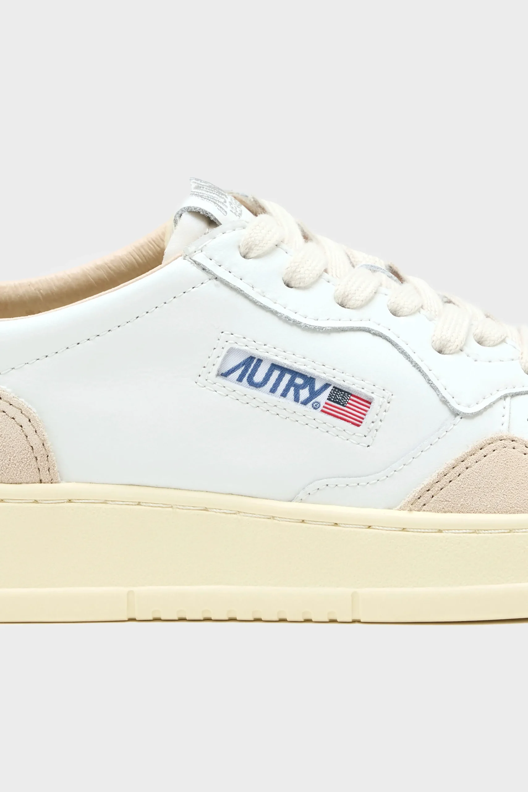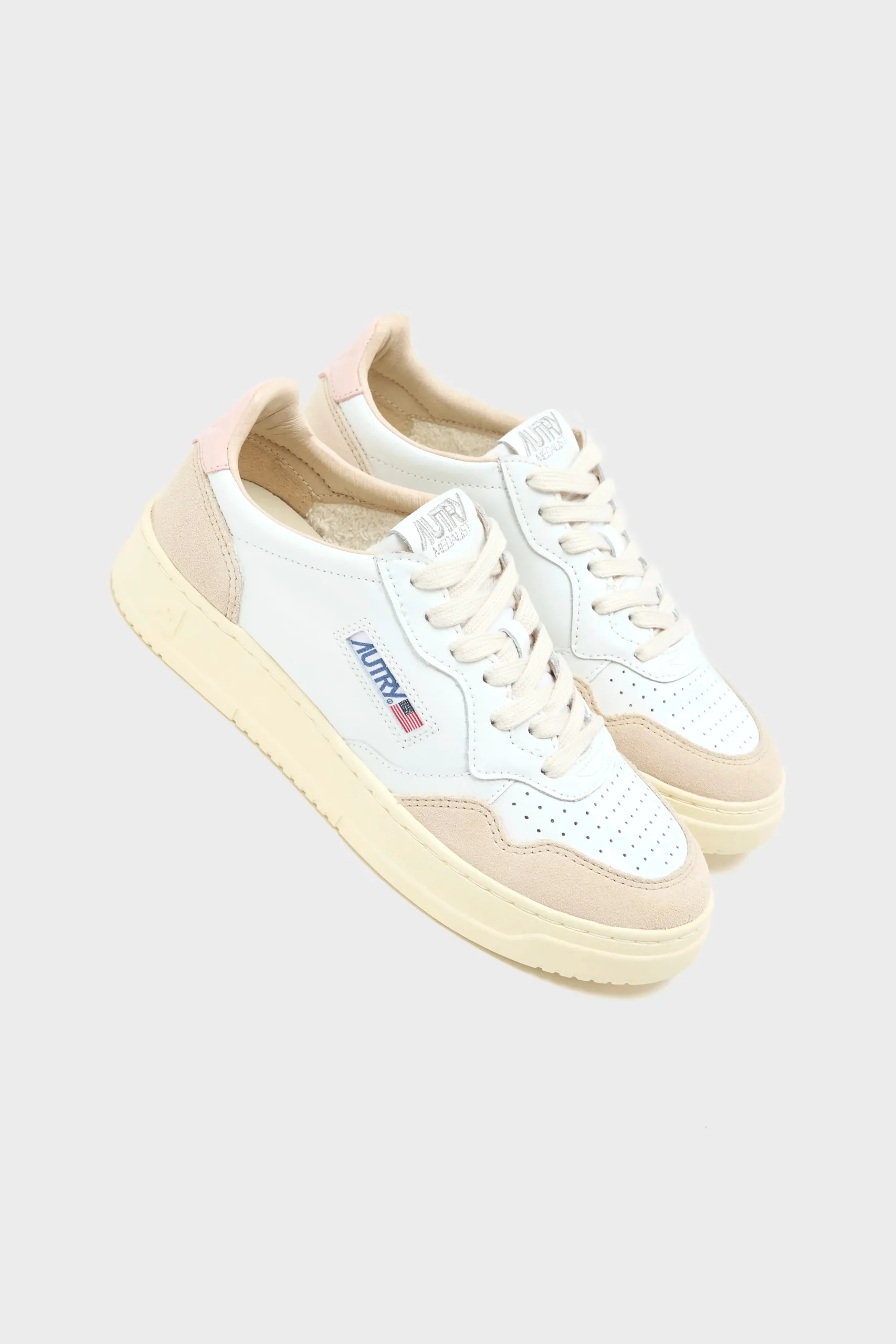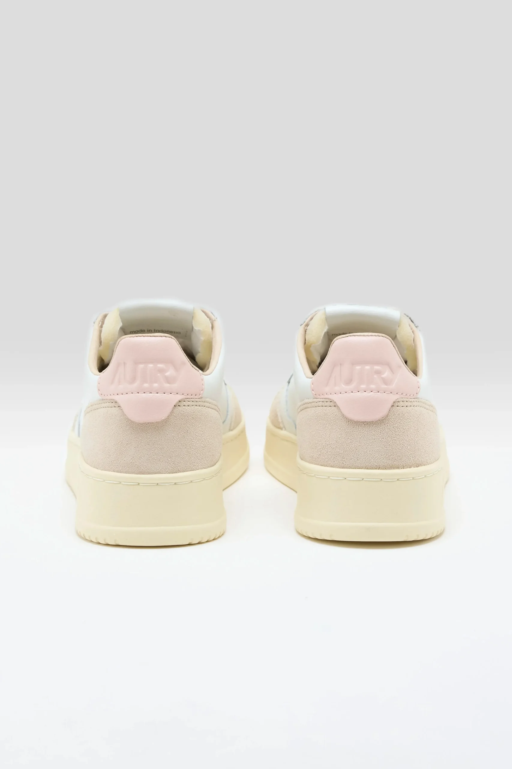 The Autry Medalist Low sneaker features a natural, supple white leather upper with beige suede panels and pink leather heel tab