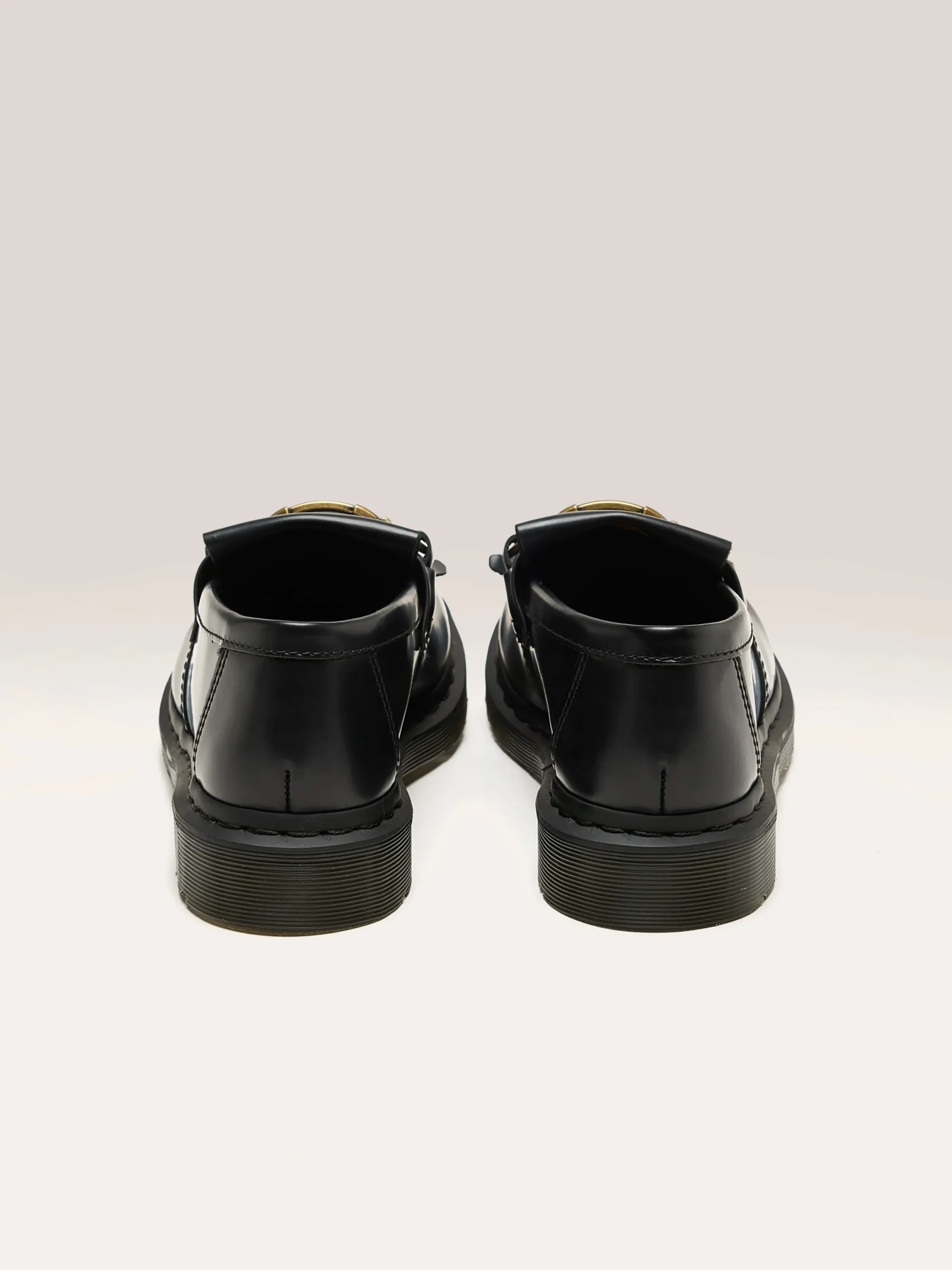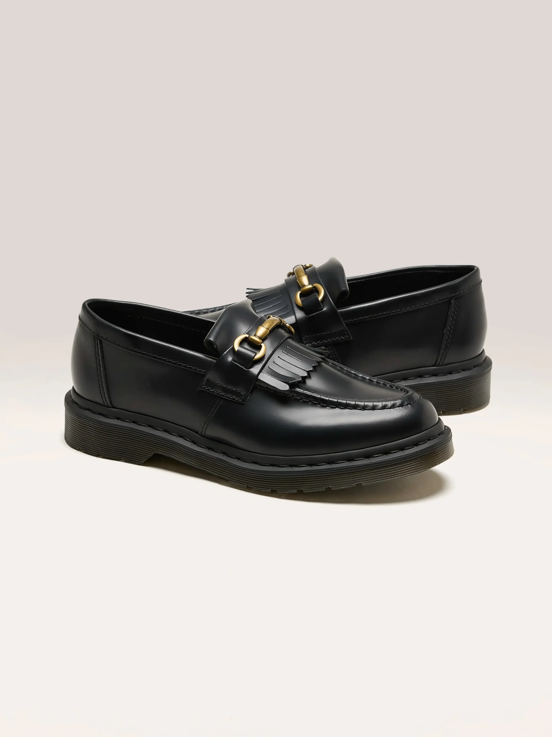 De klassieke Dr. Martens slip-on Adrian Snaffle Tassel instappers in glad, gepolijst zwart leder heeft een welt stitch e…