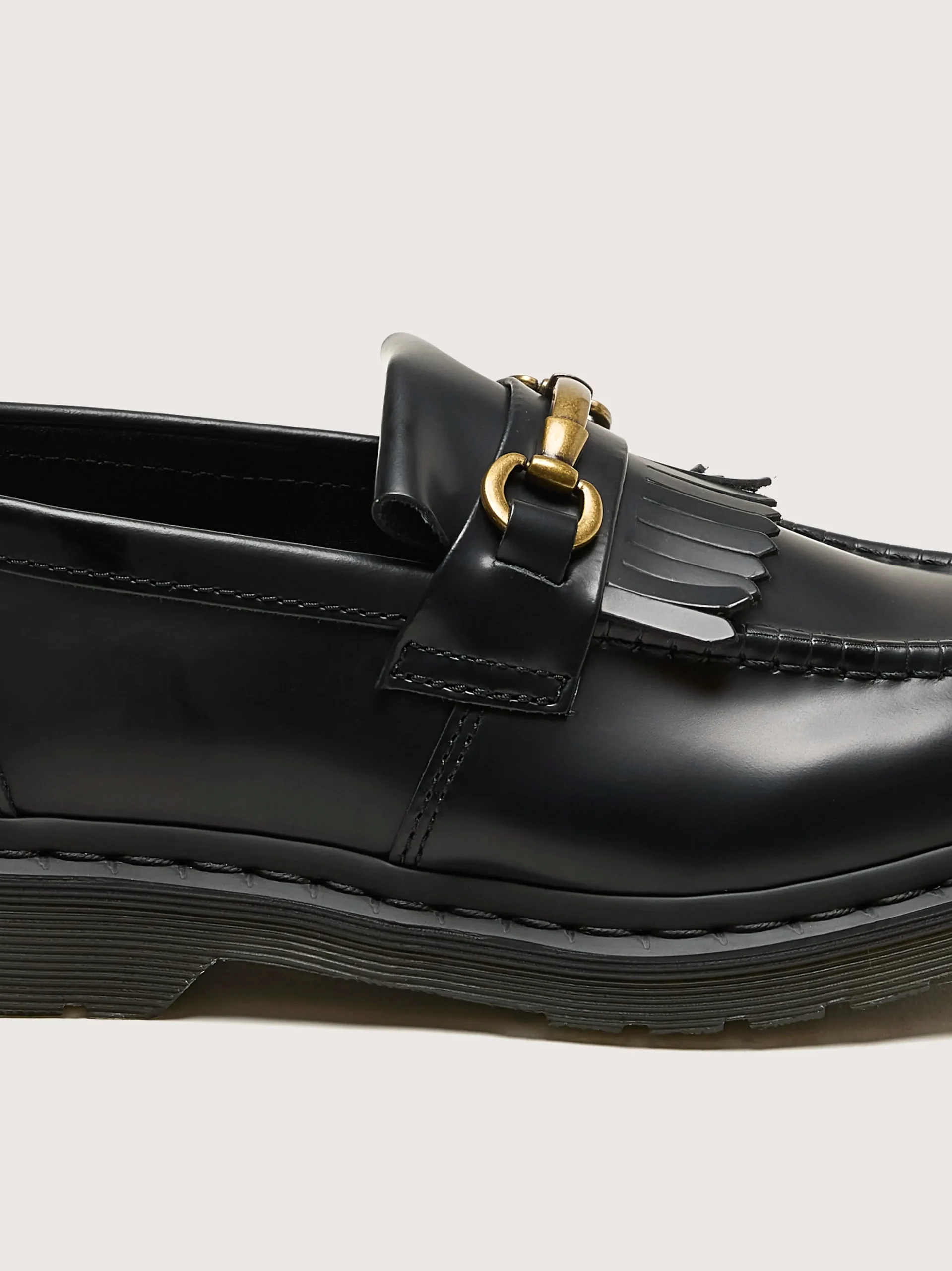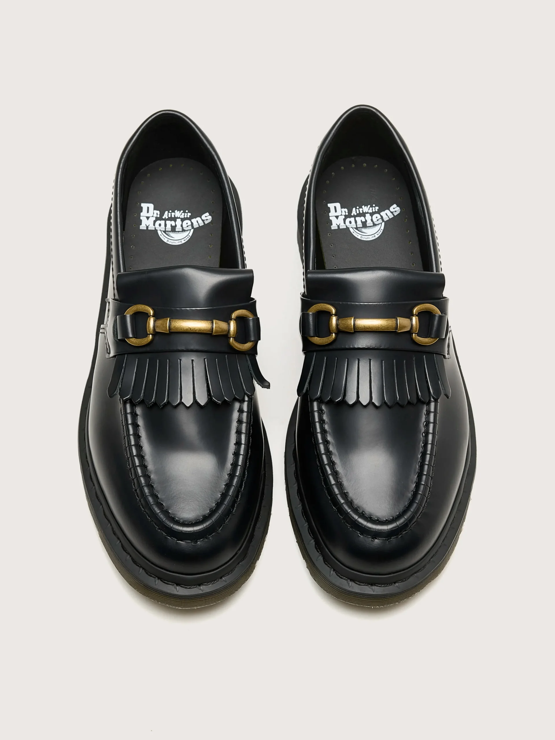De klassieke Dr. Martens slip-on Adrian Snaffle Tassel instappers in glad, gepolijst zwart leder heeft een welt stitch en een AirWair dempende zool. Stijl: 32102001Kleur: Zwart – Glad gepolijst