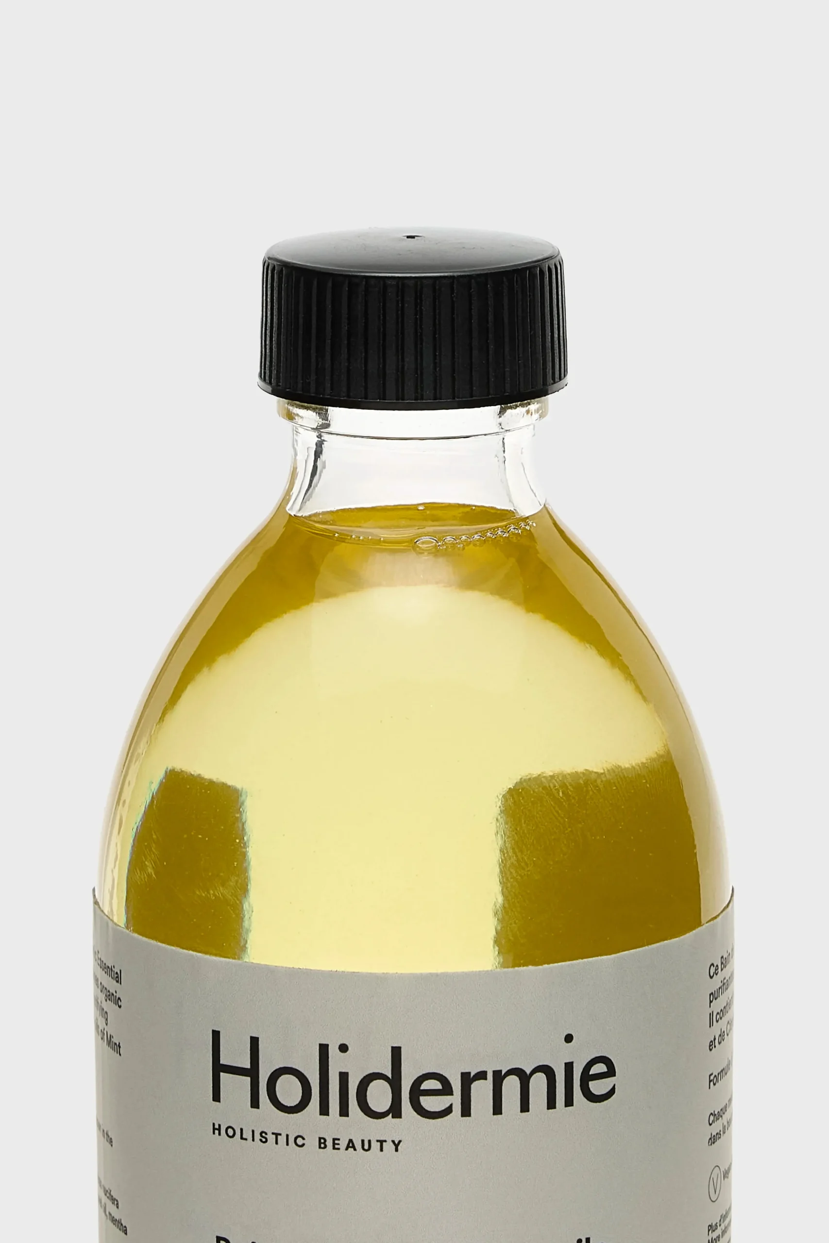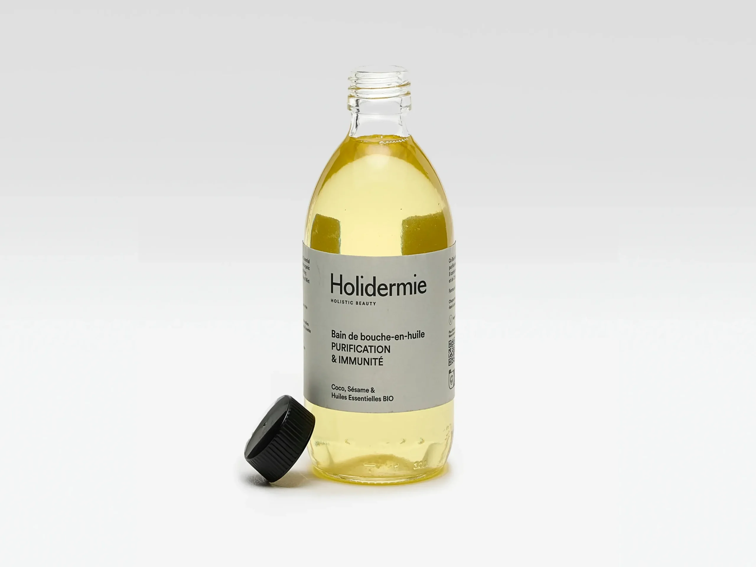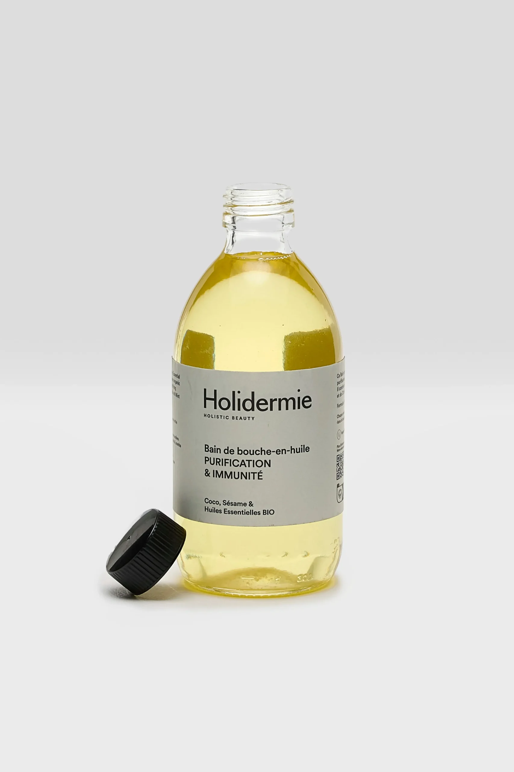 Maintain a healthy mouth with Holidermie Mouthwash-in-oil, formulated with soothing organic mint and antiseptic organic lemon essential oils.Primary ingredients: Coconut oil, Sesame oil, Organic mint and lemon essential oilUse: Every morning on an empty stomach, before brushing your teeth, take a spoonful of oil into your mouth, circulating it for 10 minutes before pouring it into the sink.*Do not swallow, and rinse your mouth thoroughly with water afterwards.From a certain low temperature level, it is normal to see white deposits appear in the bottle, indicating that the coconut oil is solidifying.Store in a cool environment away from light.Use within nine months after openingMaterials: Glass jar with lid