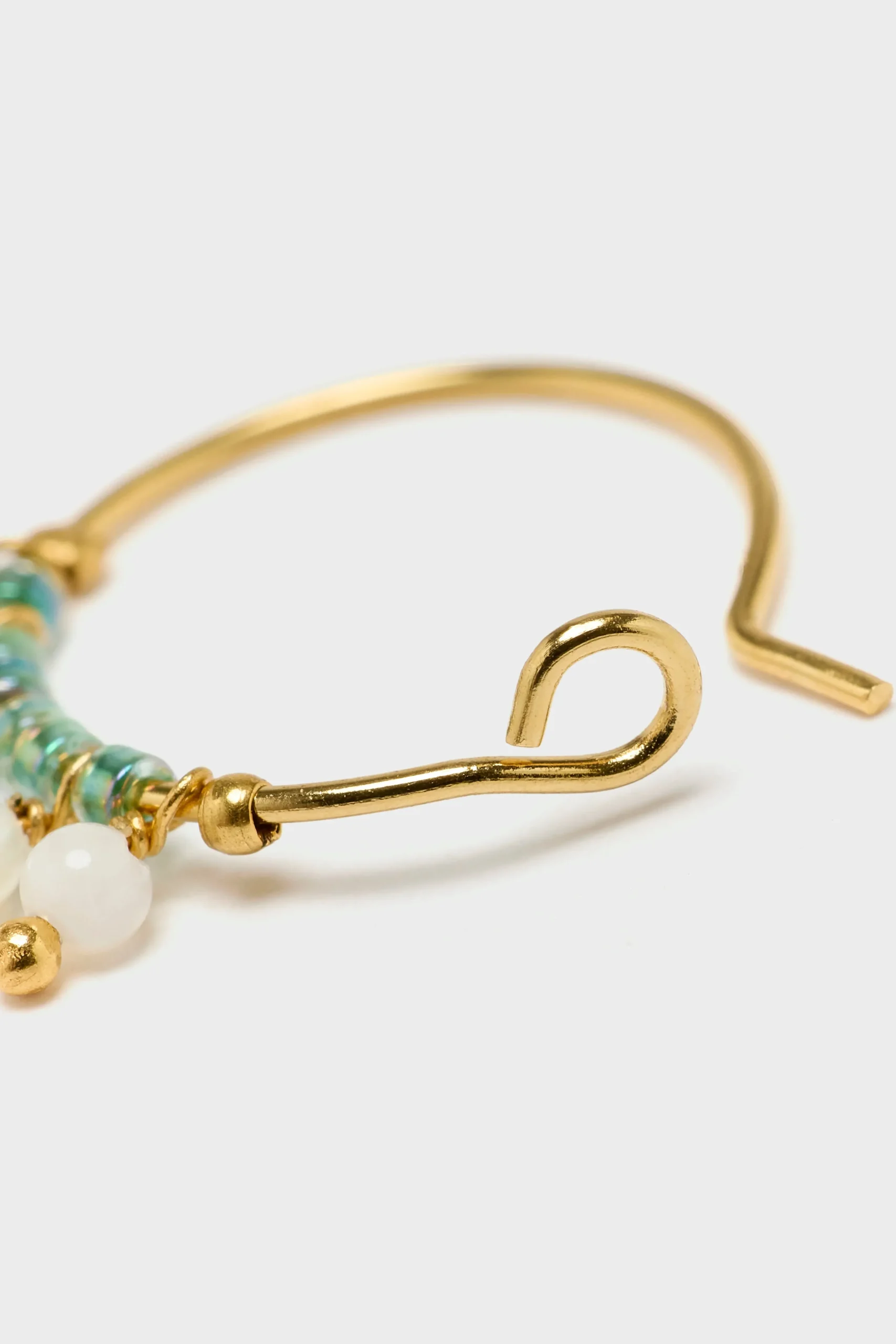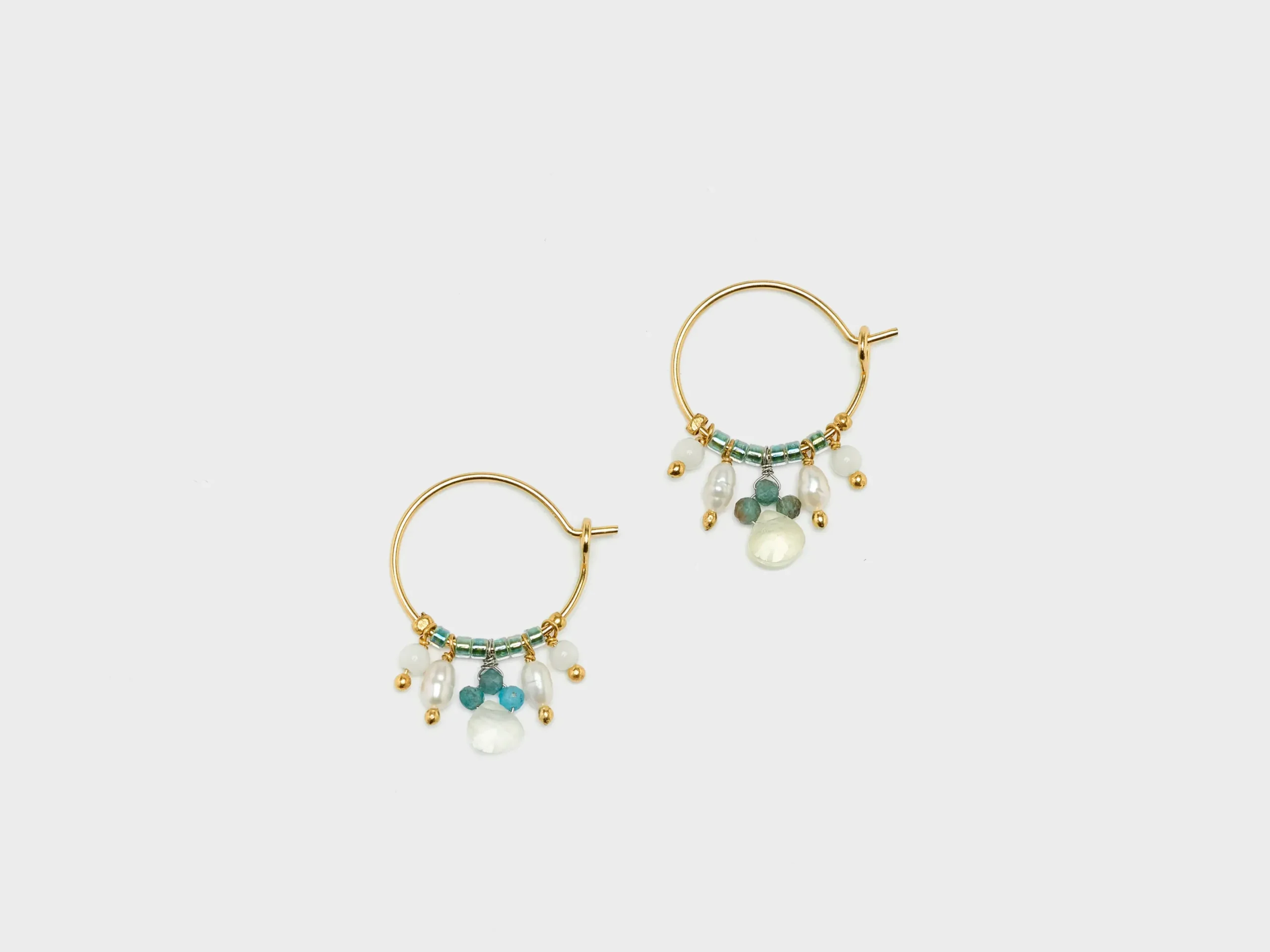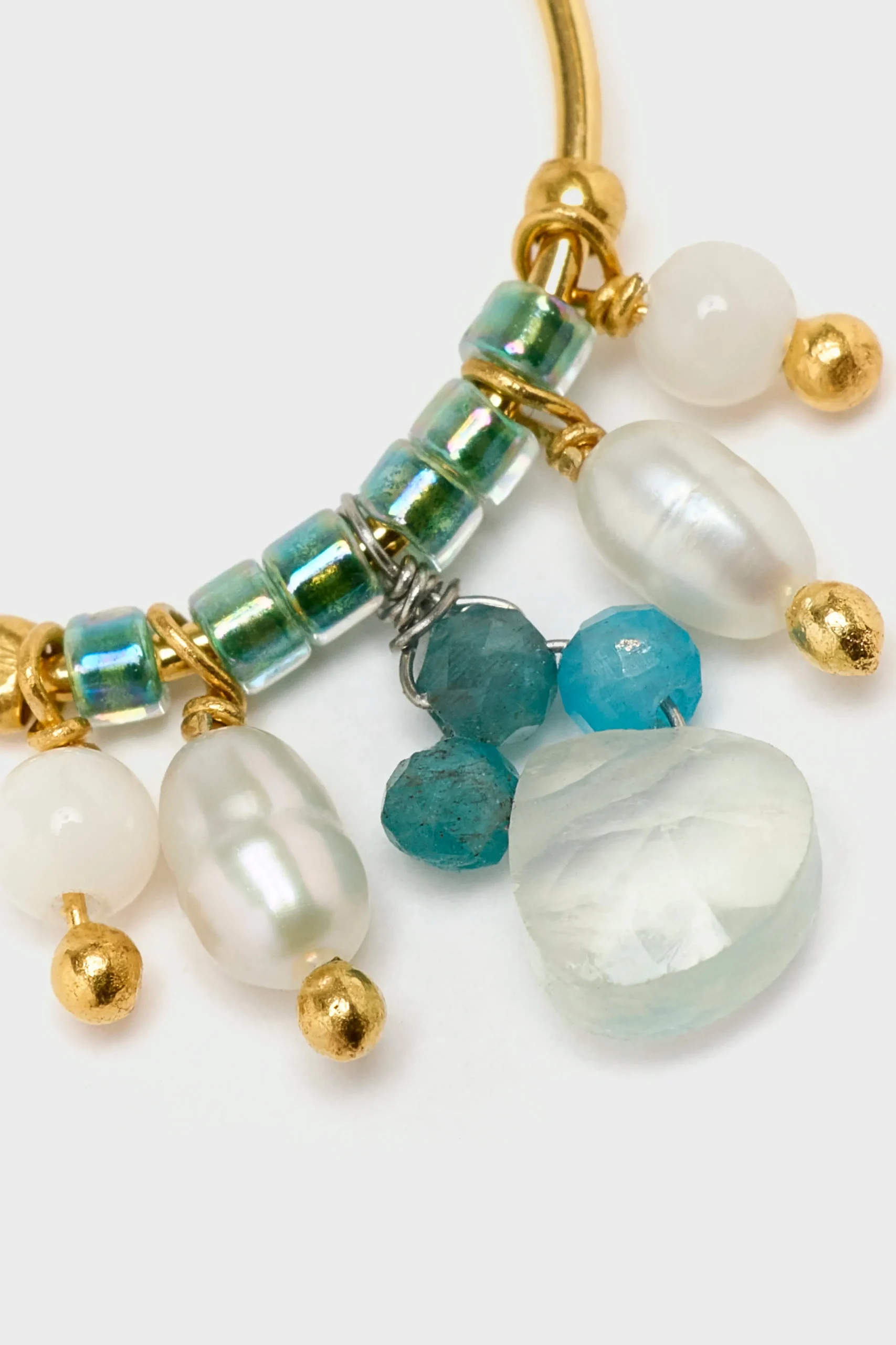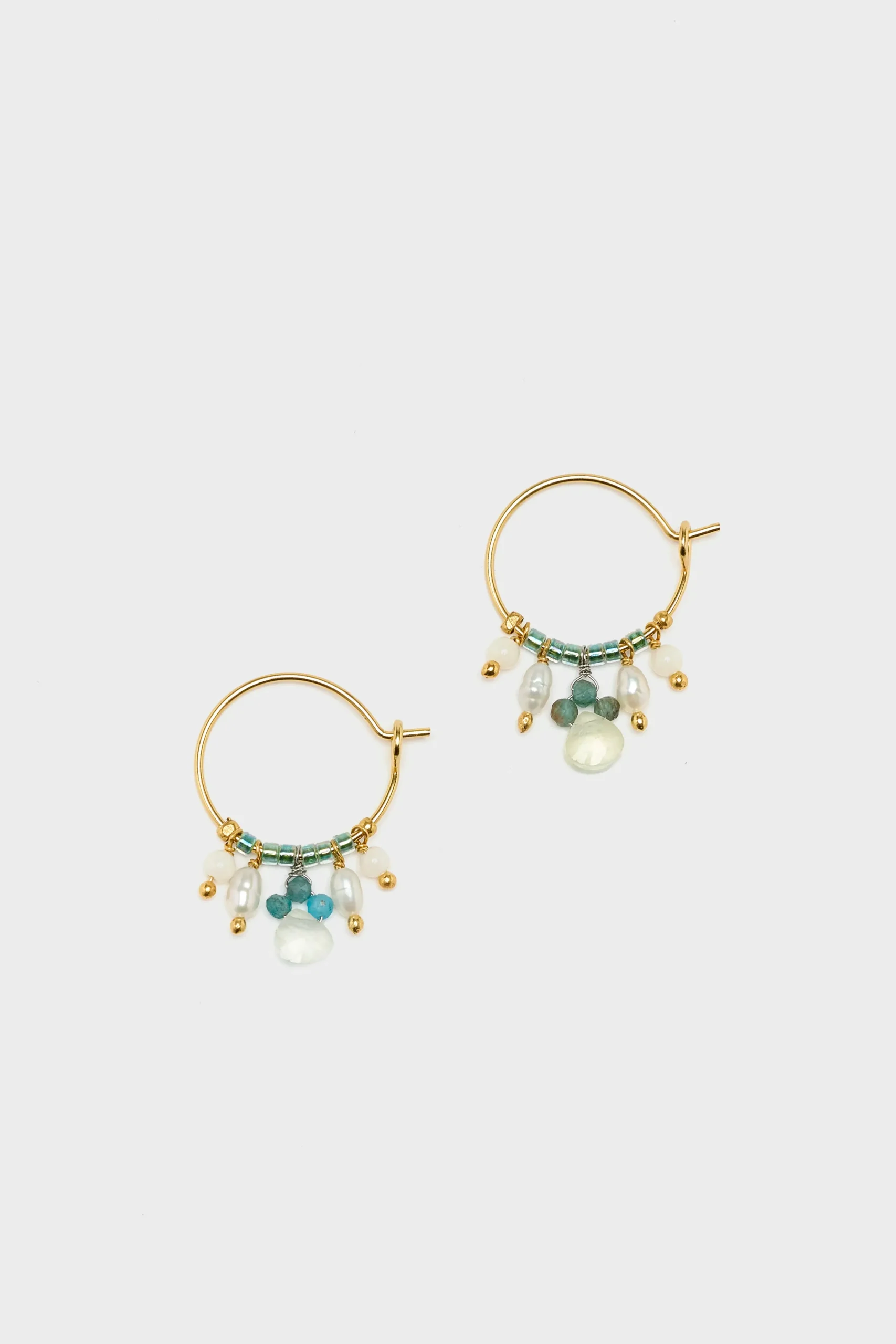 The N° 12 Le Fourbi de Capucine hoop earrings feature glass beads, gemstones, and freshwater pearls that dangle from a gold-plated brass wire hoop.