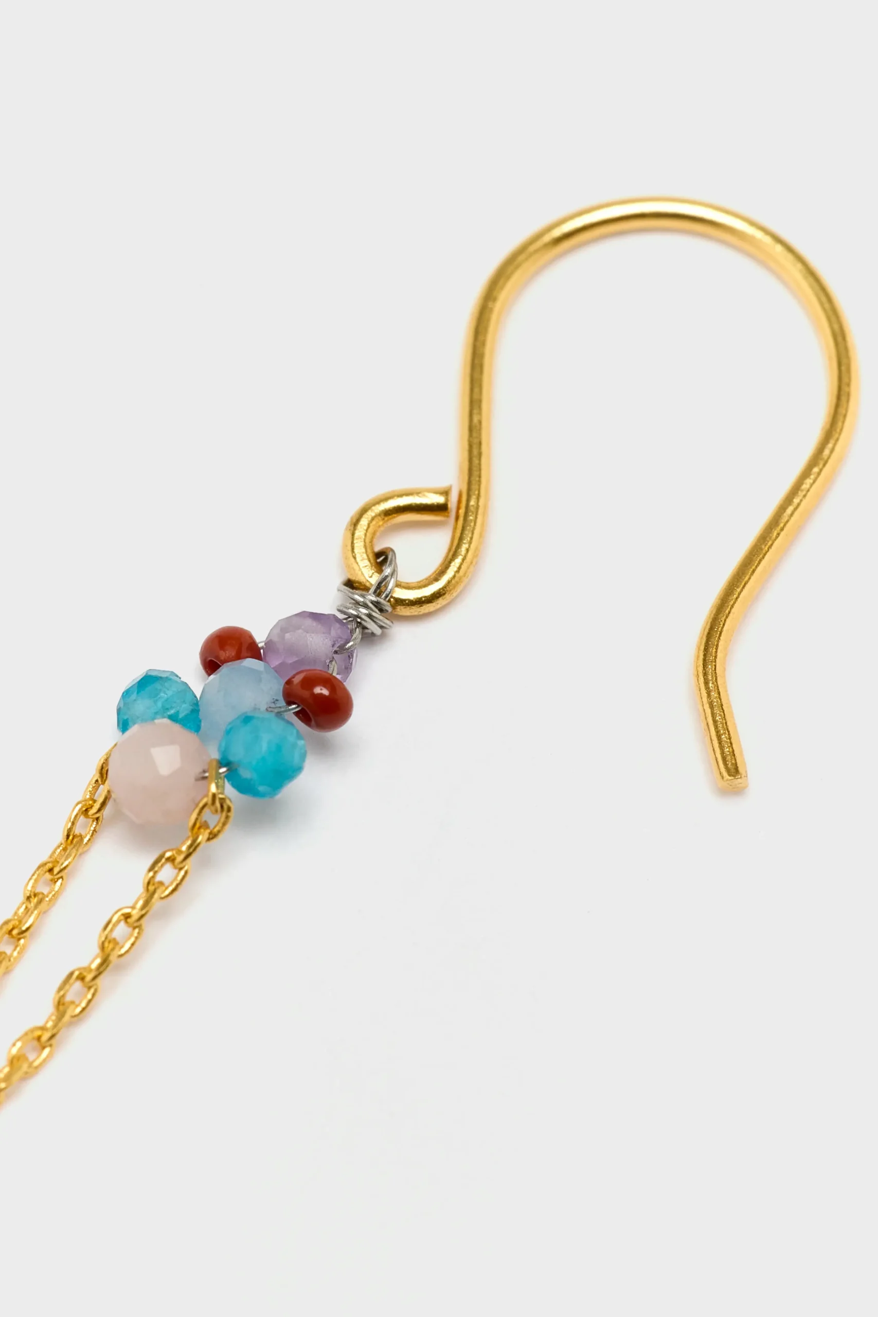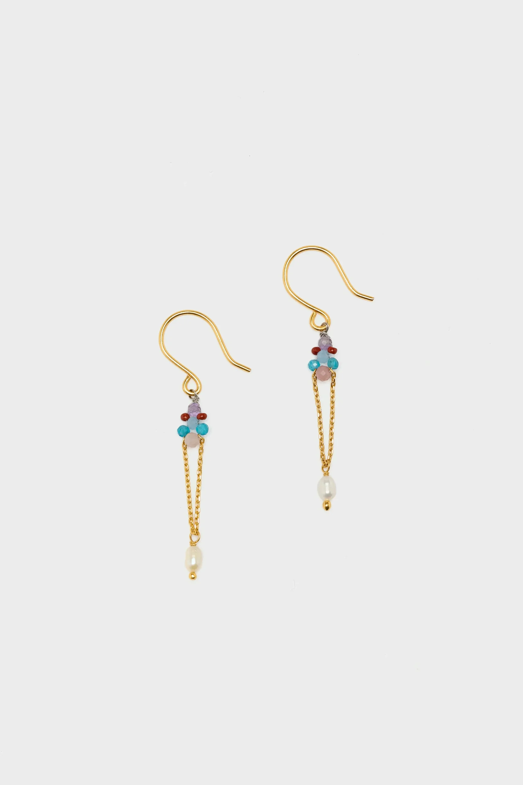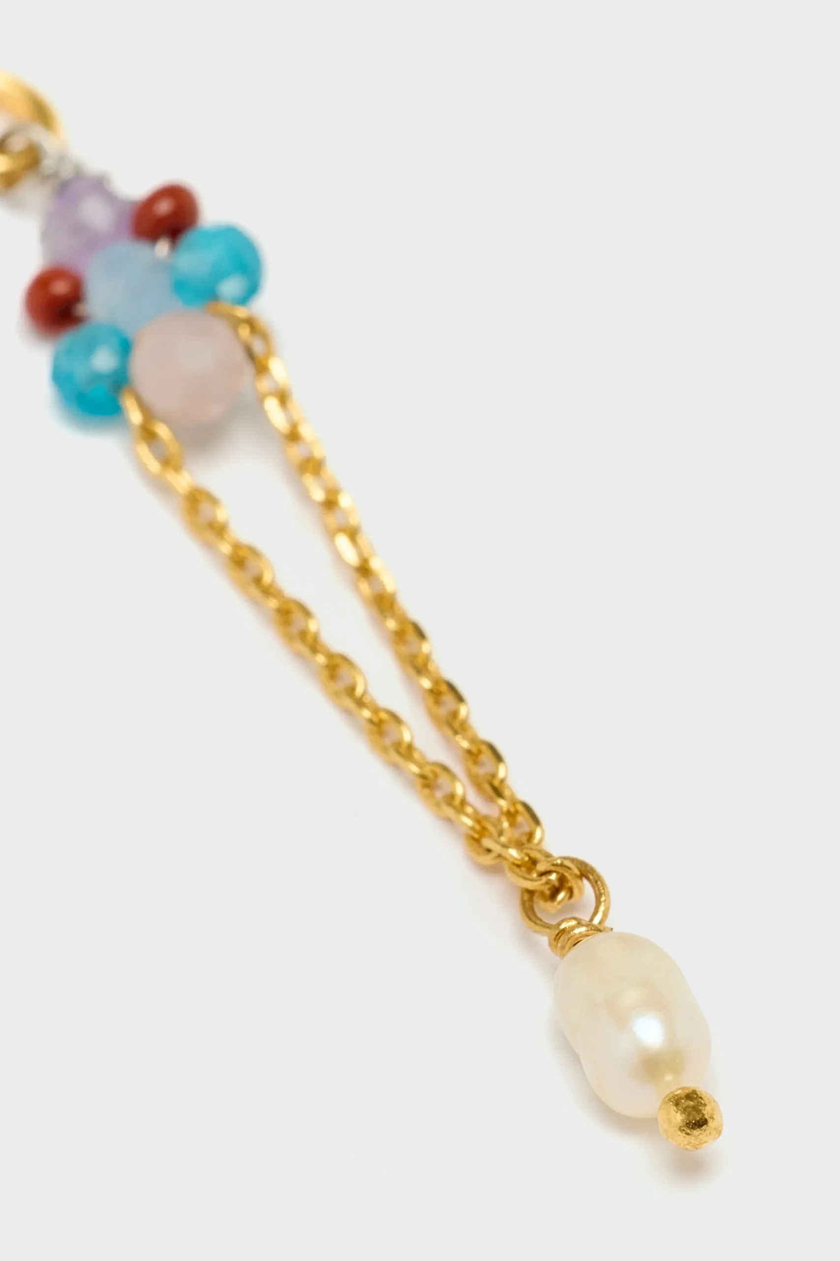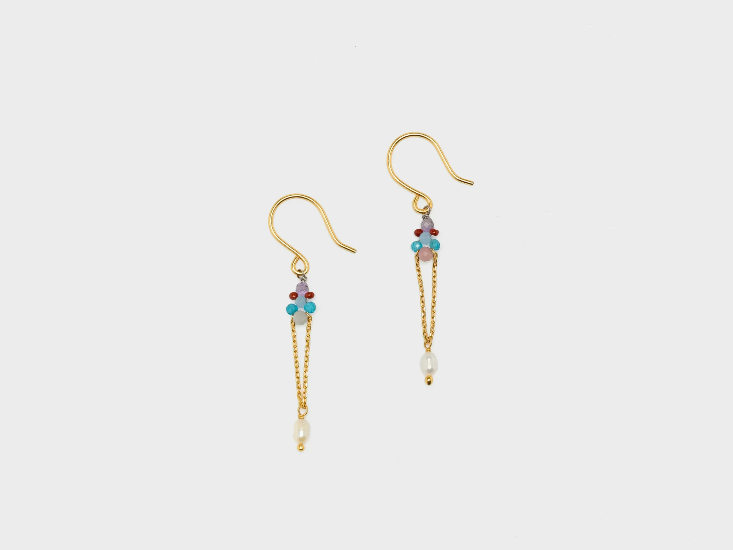 The N° 33 Le Fourbi de Capucine earrings feature gold-plated chains with colourful gemstones and a freshwater pearl suspended from gold hooks