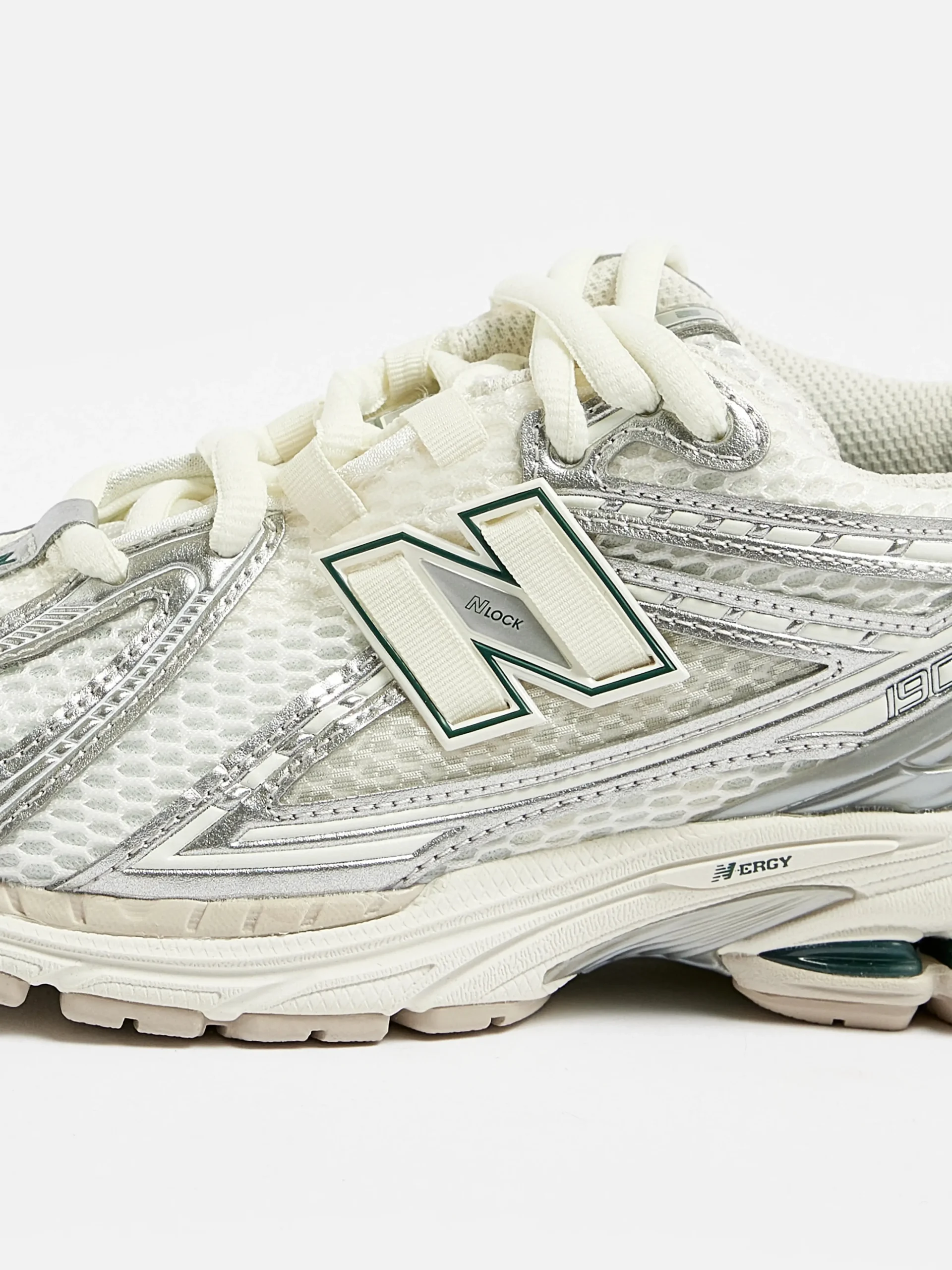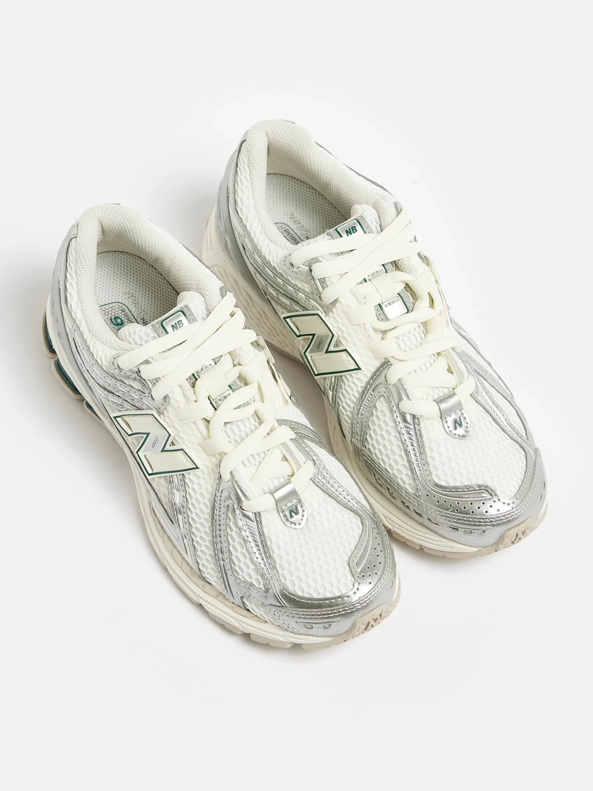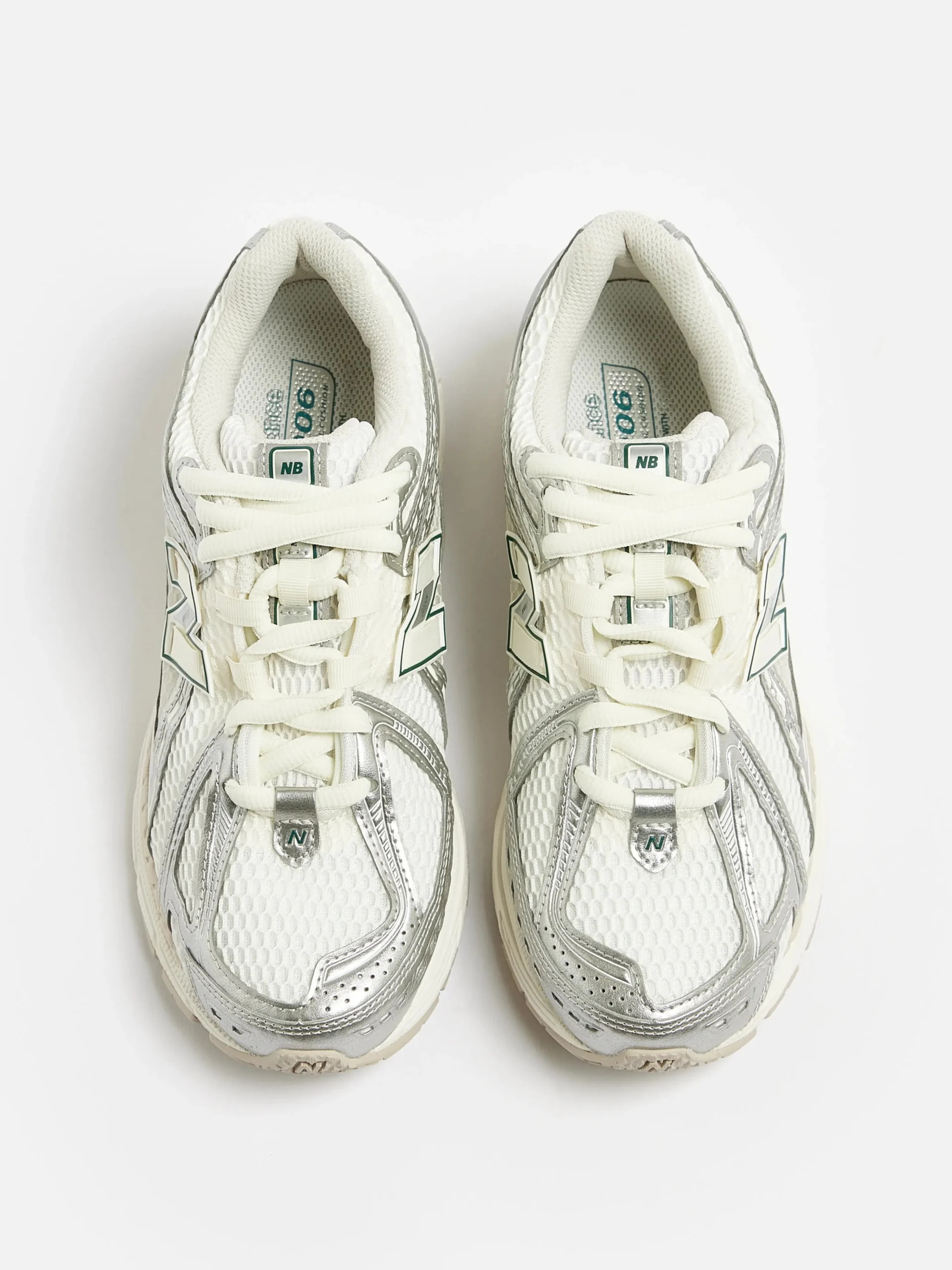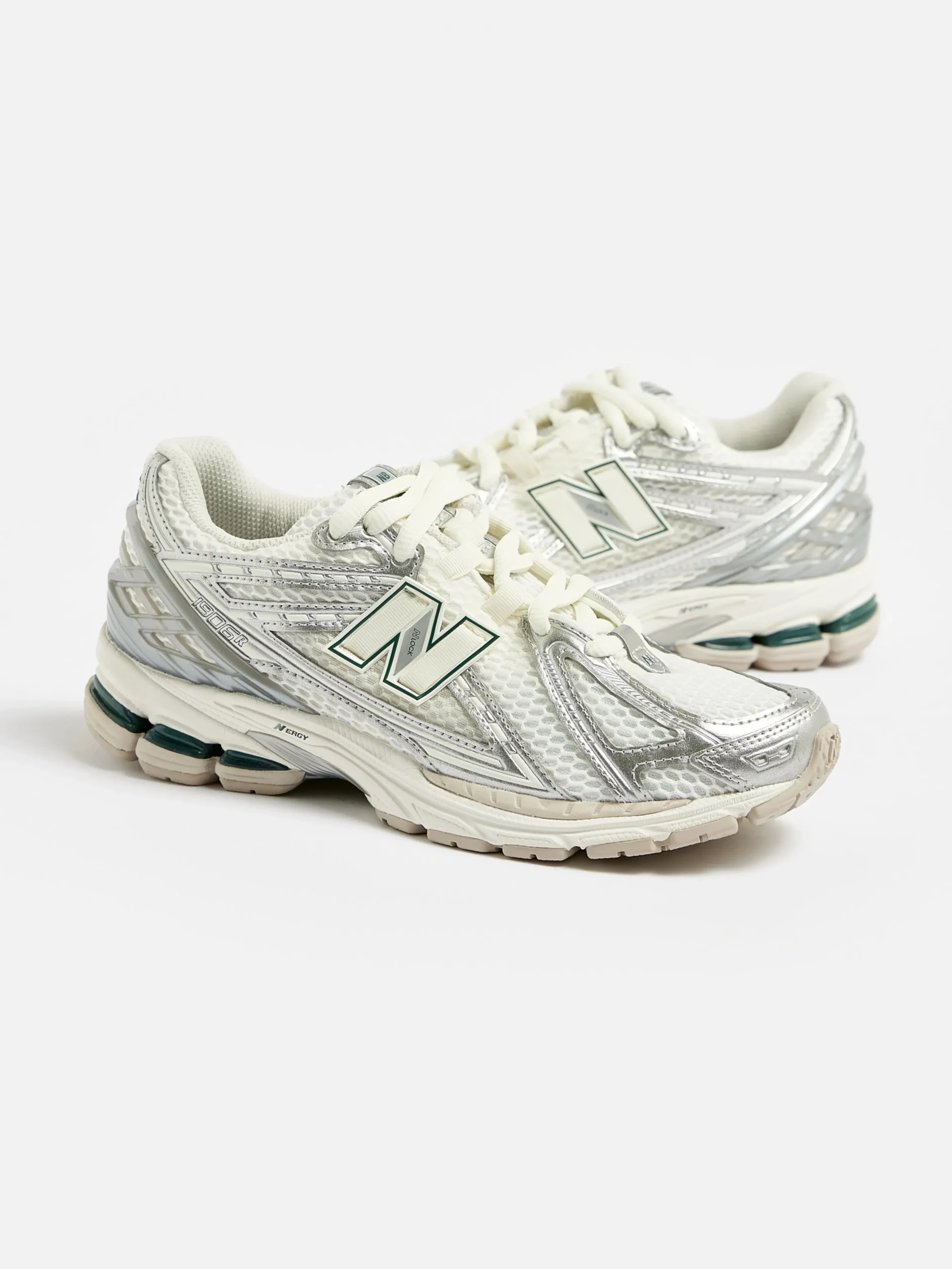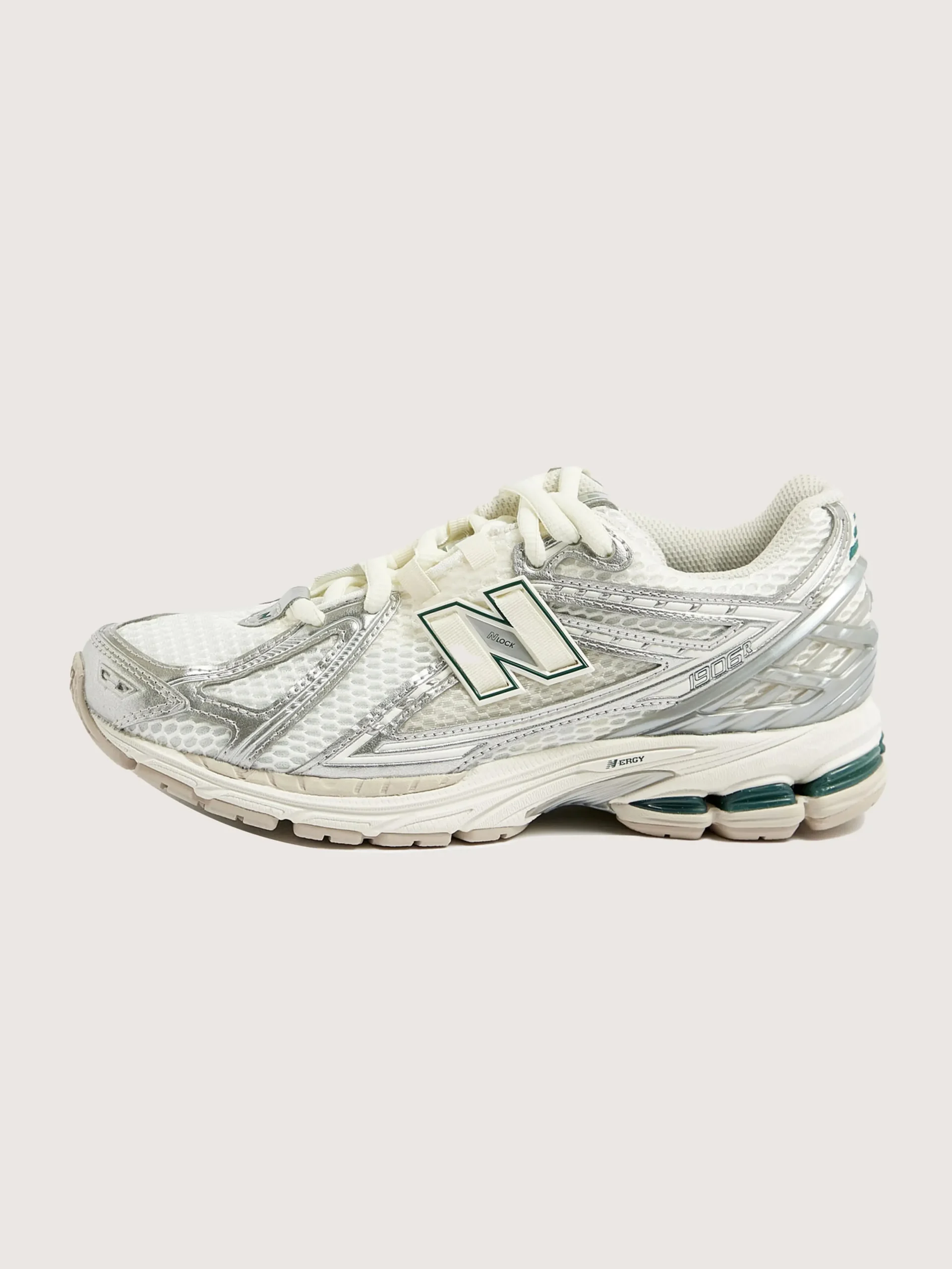 De New Balance 1906R hardloopschoenen hebben een bovenwerk van mesh met synthetische overlays en een dempende ABZORB middenzool en hiel.Stijl: M1906REEKleur: Silver metallic with sea salt and new spruce