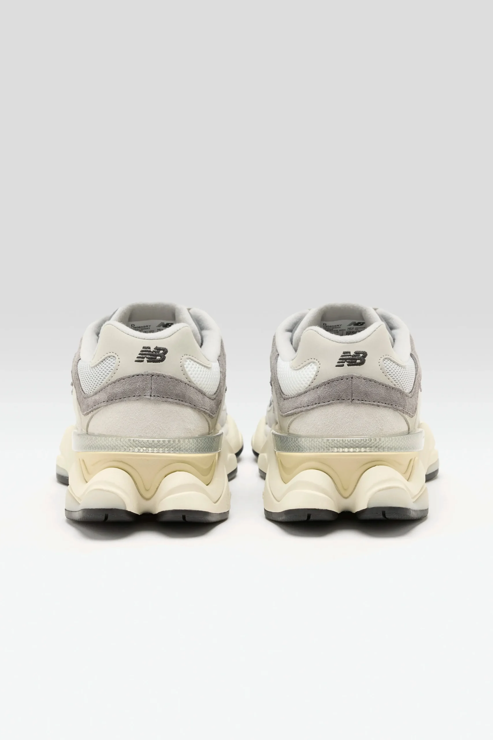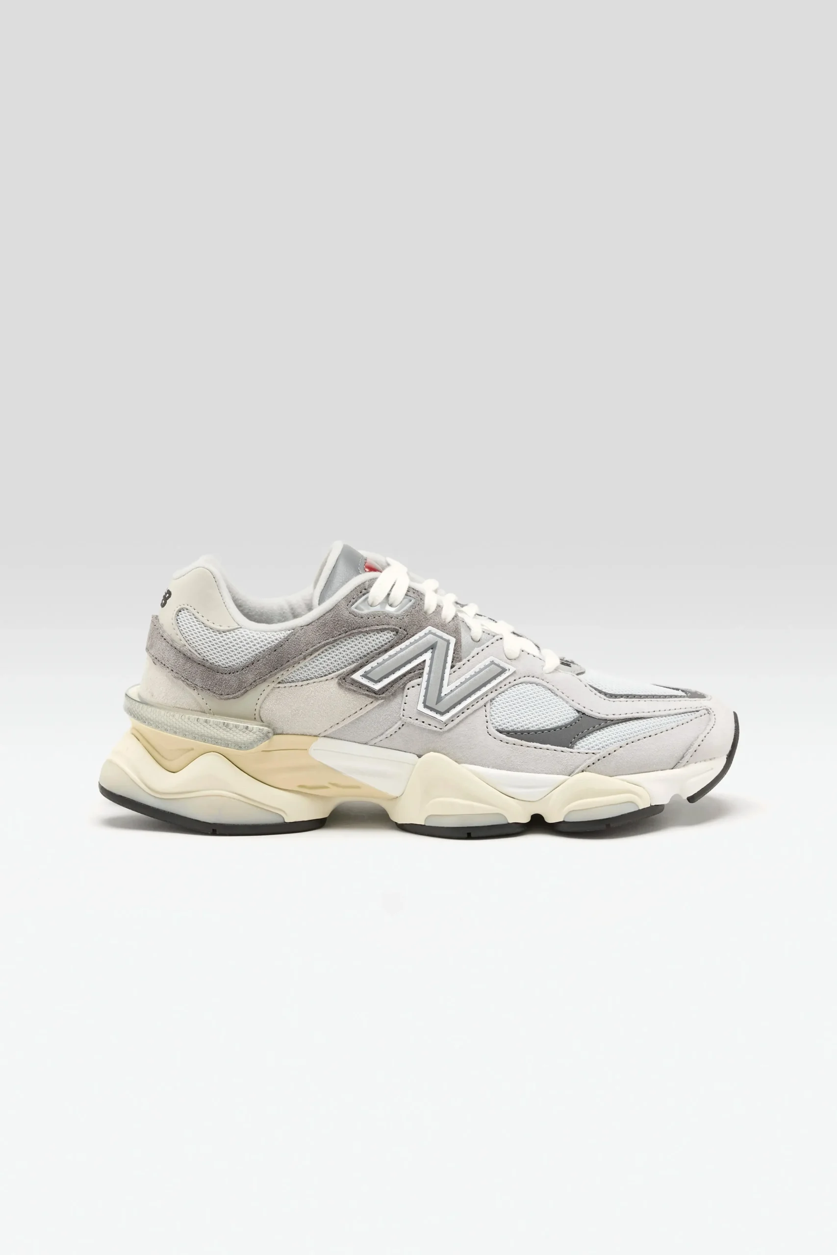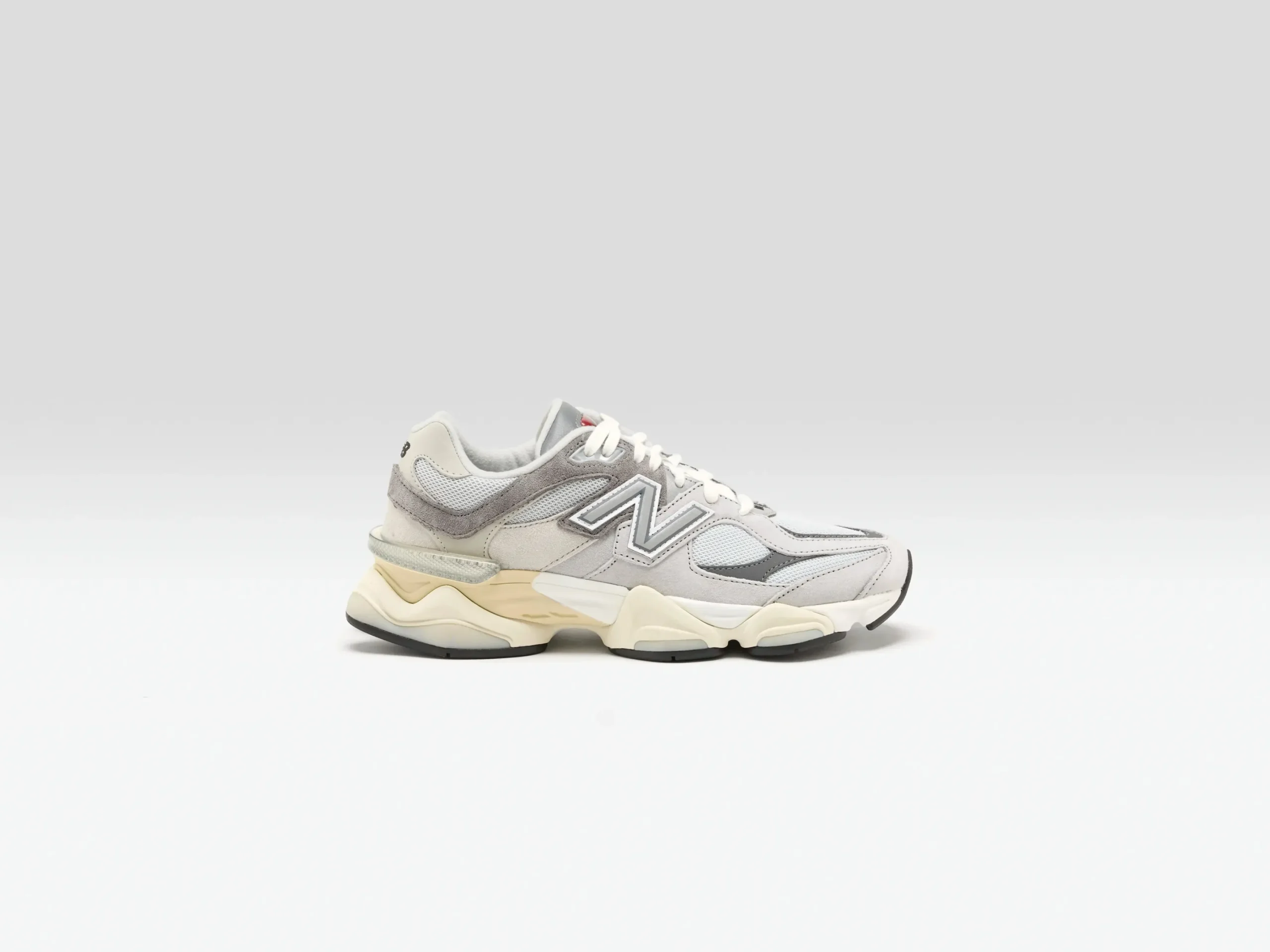 The New Balance 9060 sneakers have a mesh upper, pigskin suede overlays, and a cushioned midsole in a futuristic silhouette.