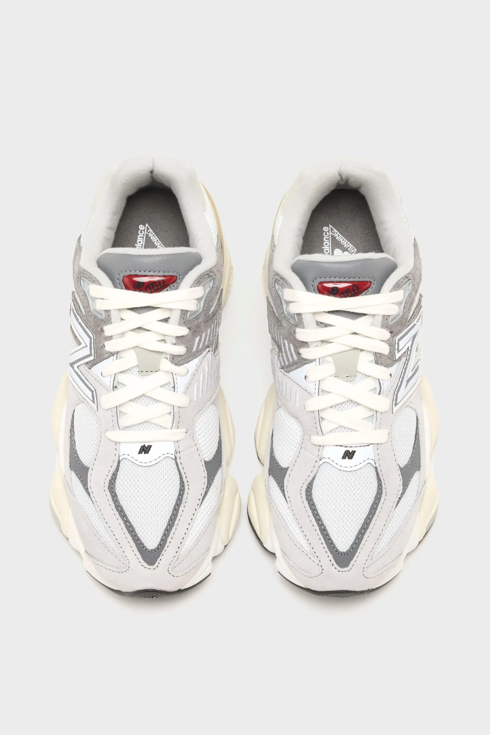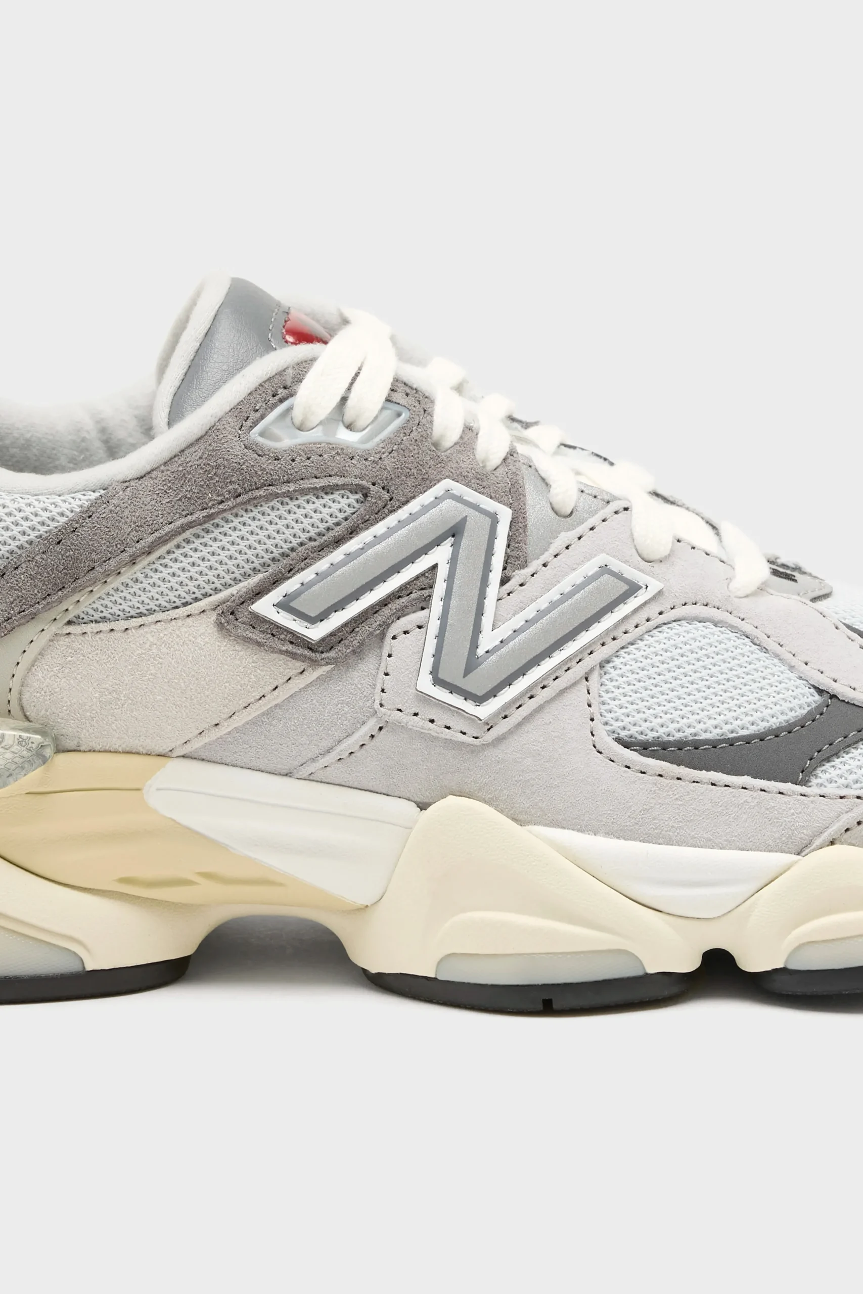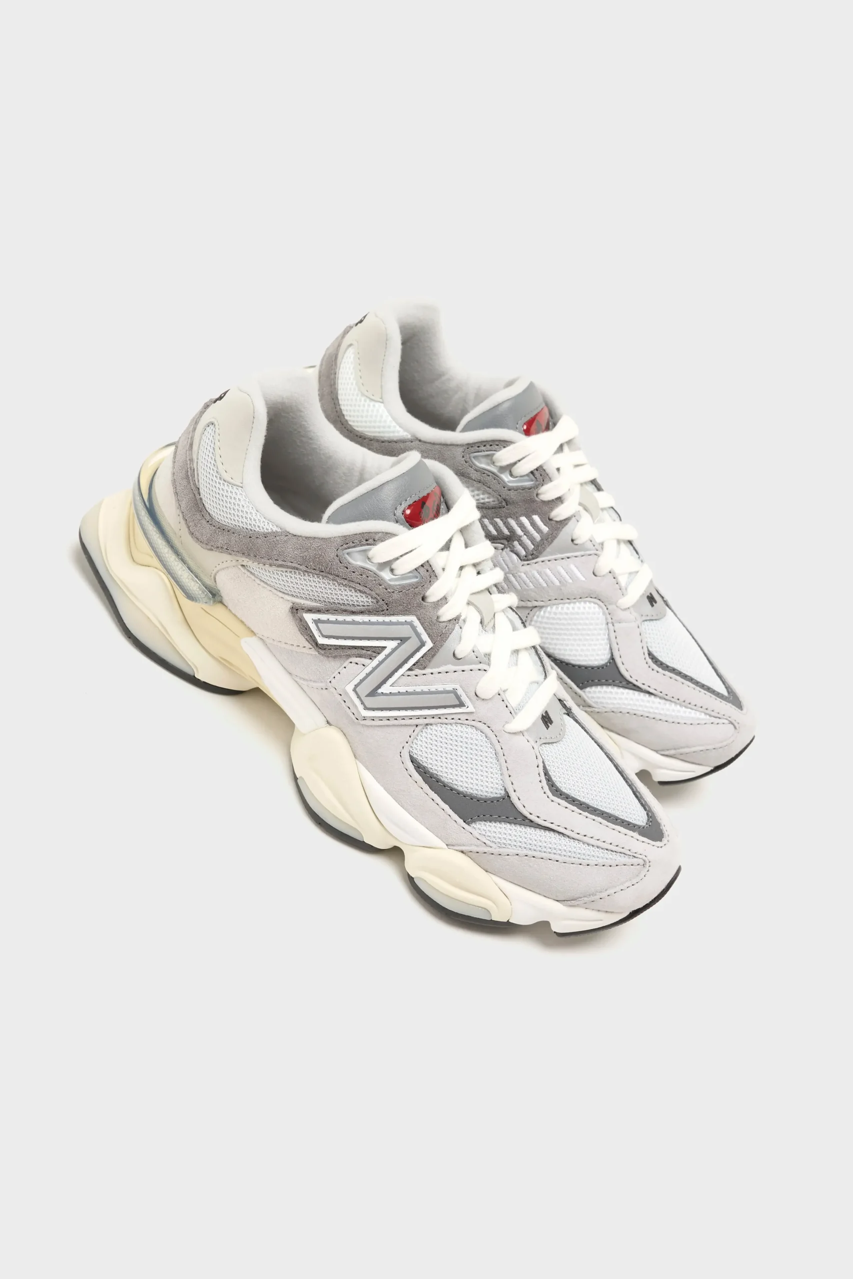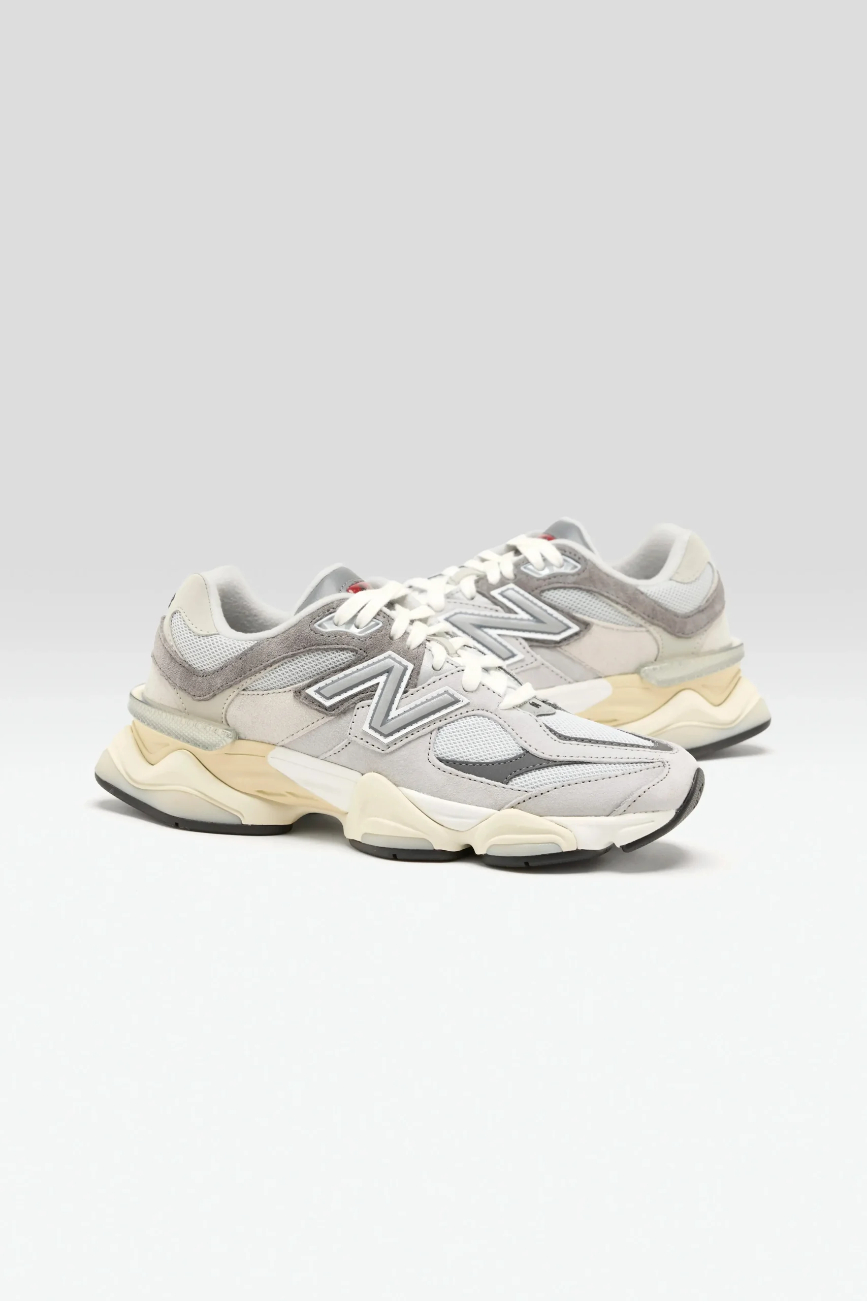 The New Balance 9060 sneakers have a mesh upper, pigskin suede overlays, and a cushioned midsole in a futuristic silhouette.
