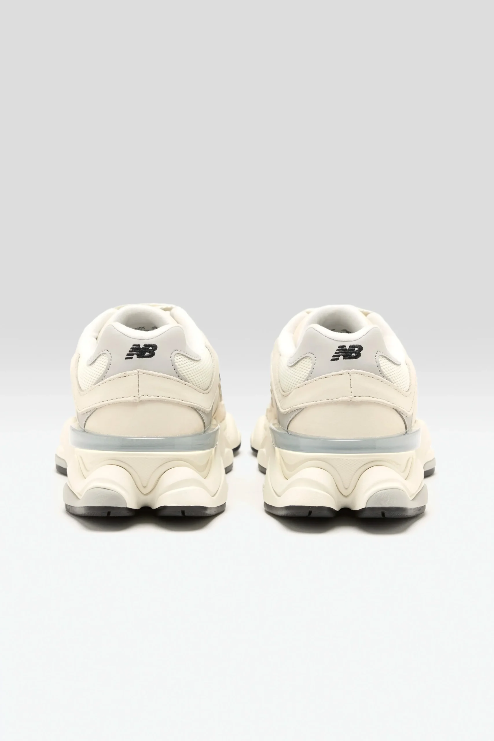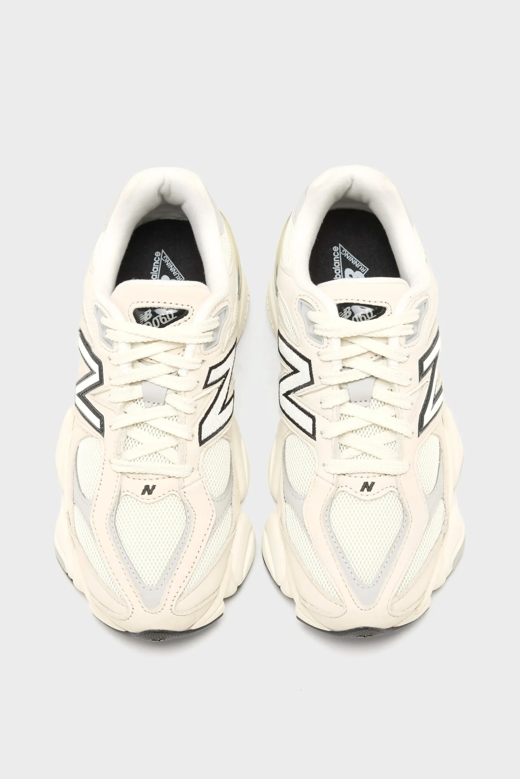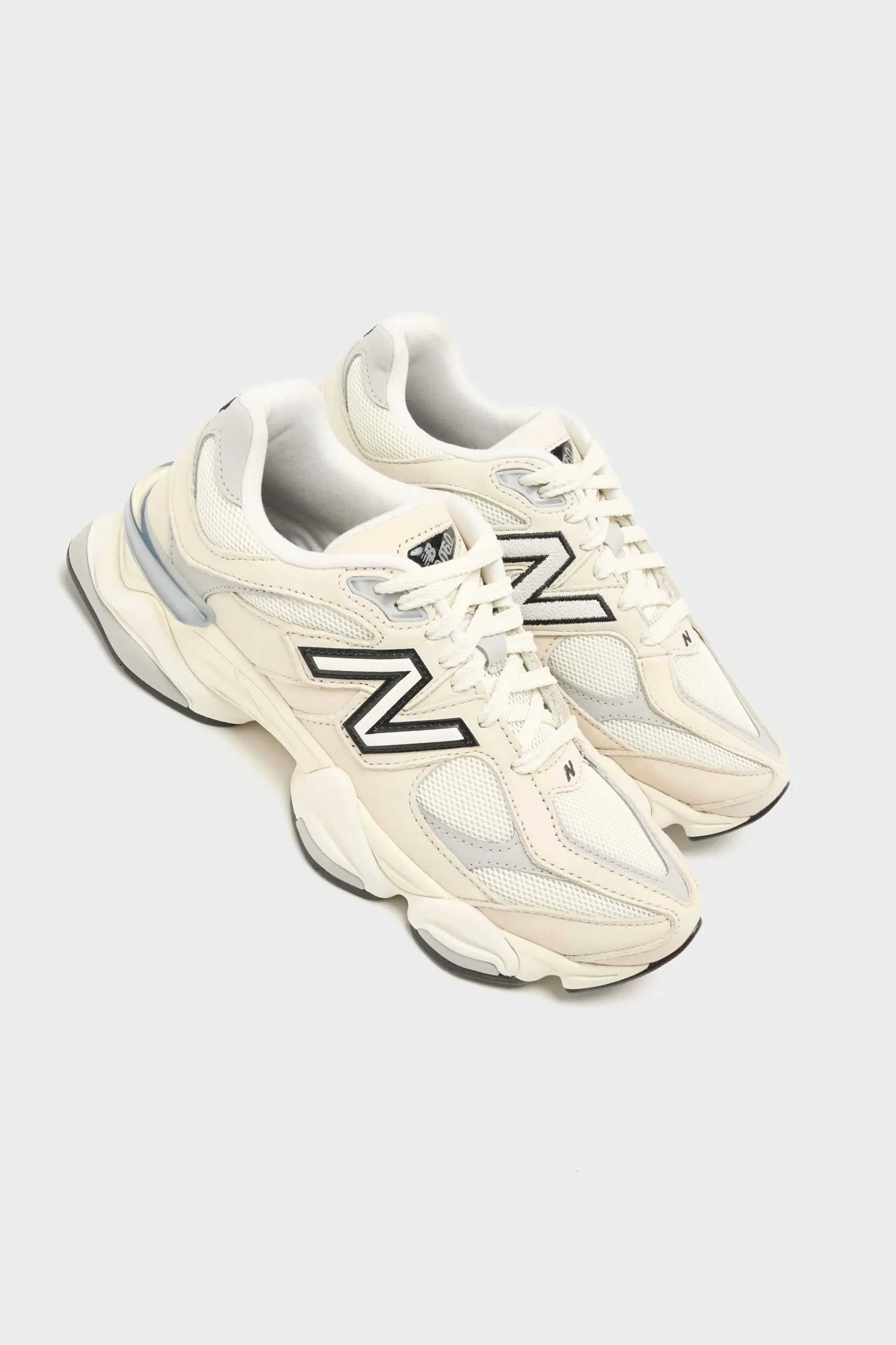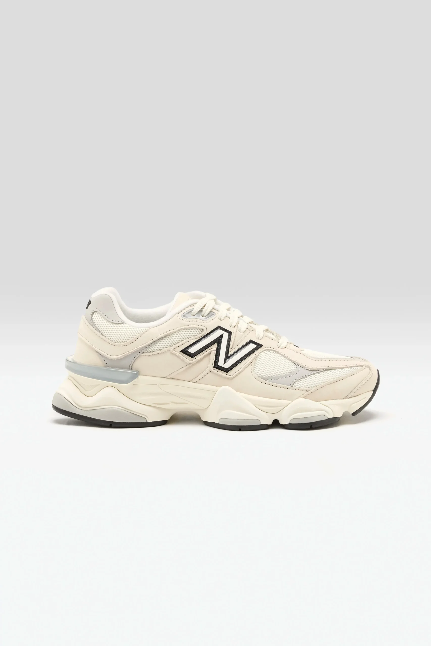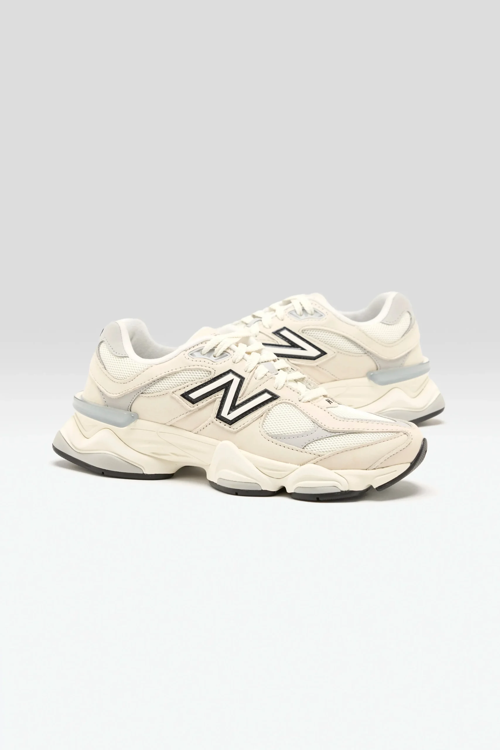 The New Balance 9060 sneakers have a mesh upper, pigskin suede overlays, and a cushioned midsole in a futuristic silhouette.