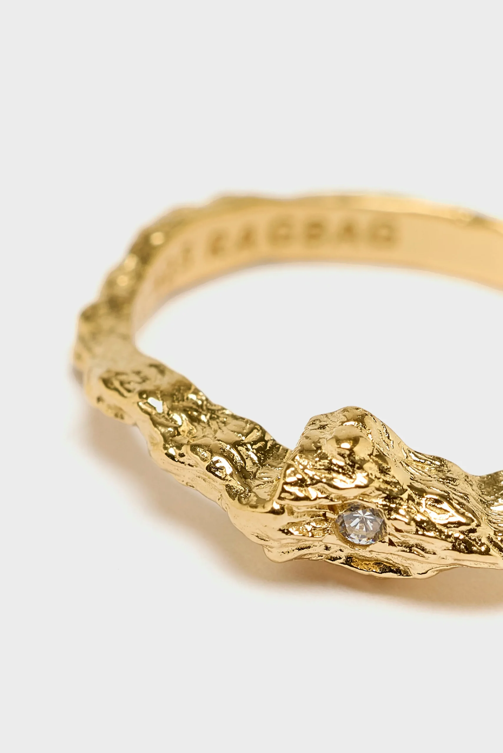 The Ragbag Shoreline Small Ring showcases an organically textured design crafted from 18k gold-plated sterling silver, featuring a flush set Cz crystal stone.