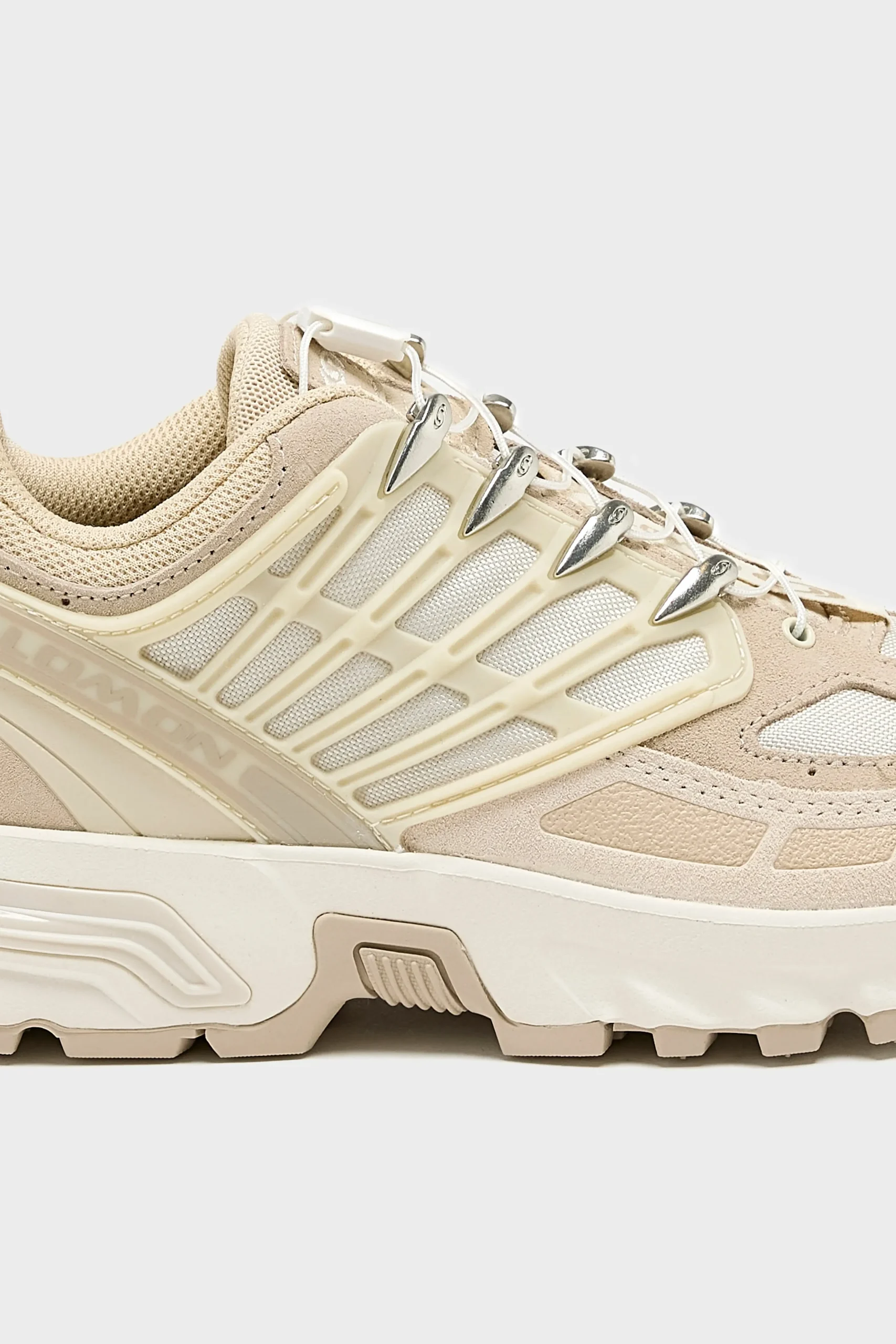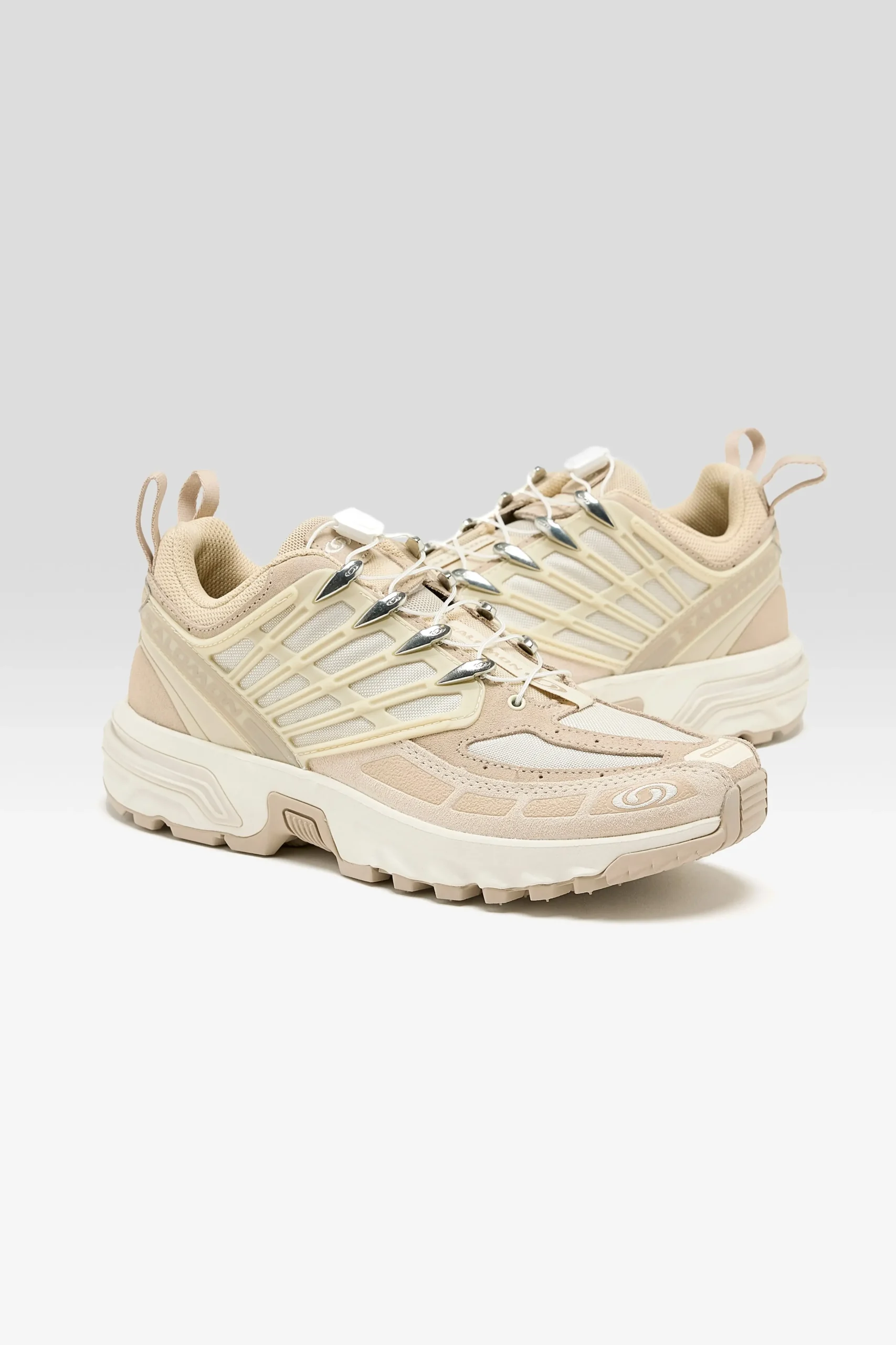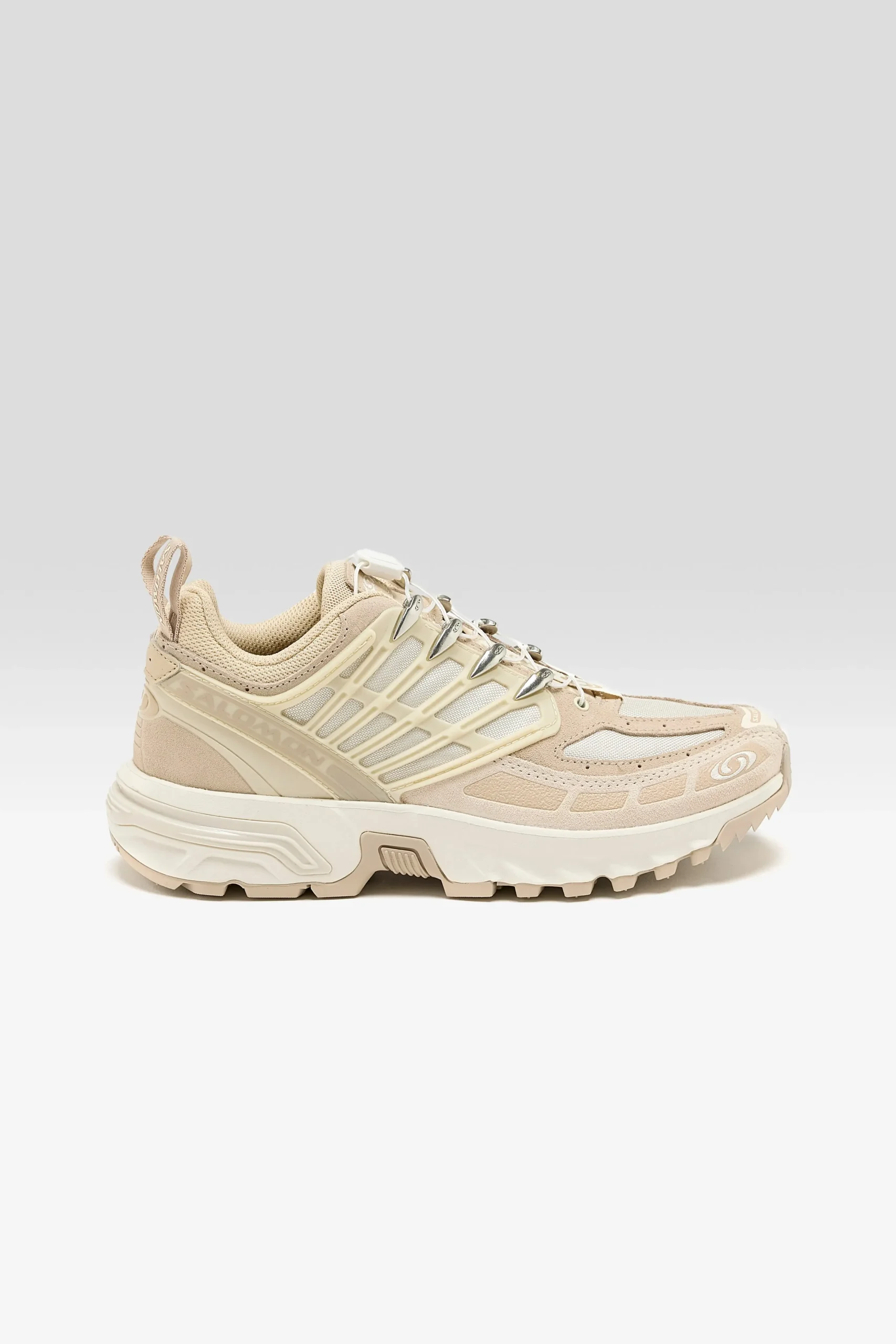 The Salomon ACS PRO Leather sportstyle sneakers feature a dirt-resistant, single-layer mesh upper with suede leather overlays.
