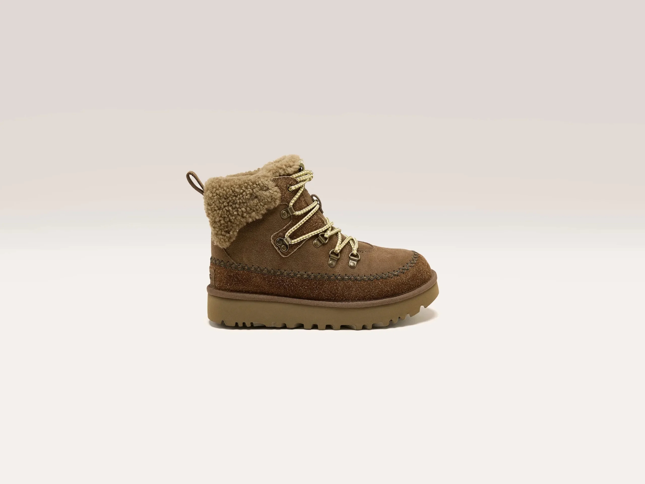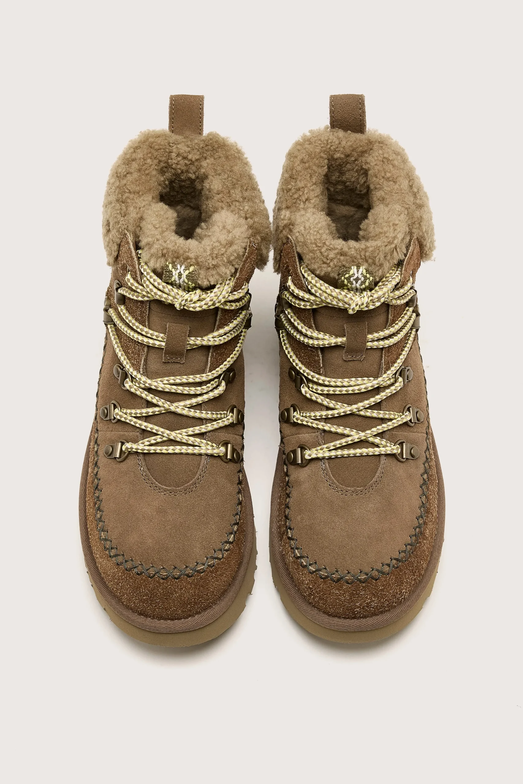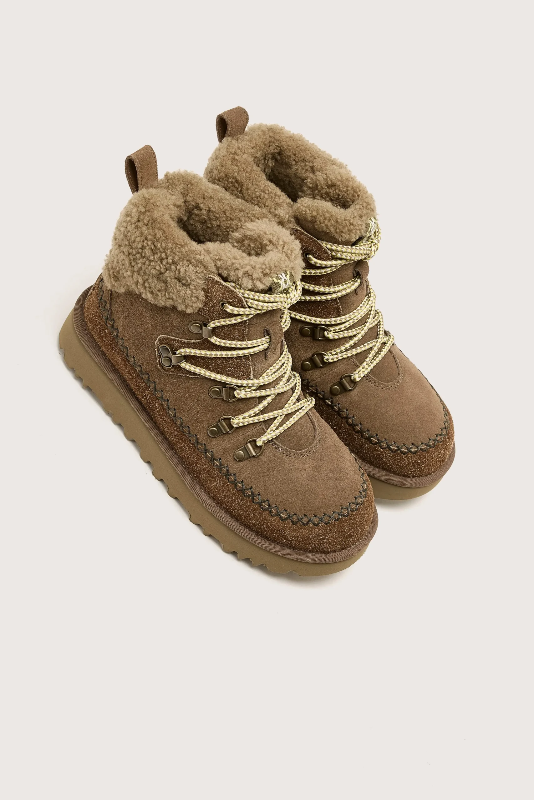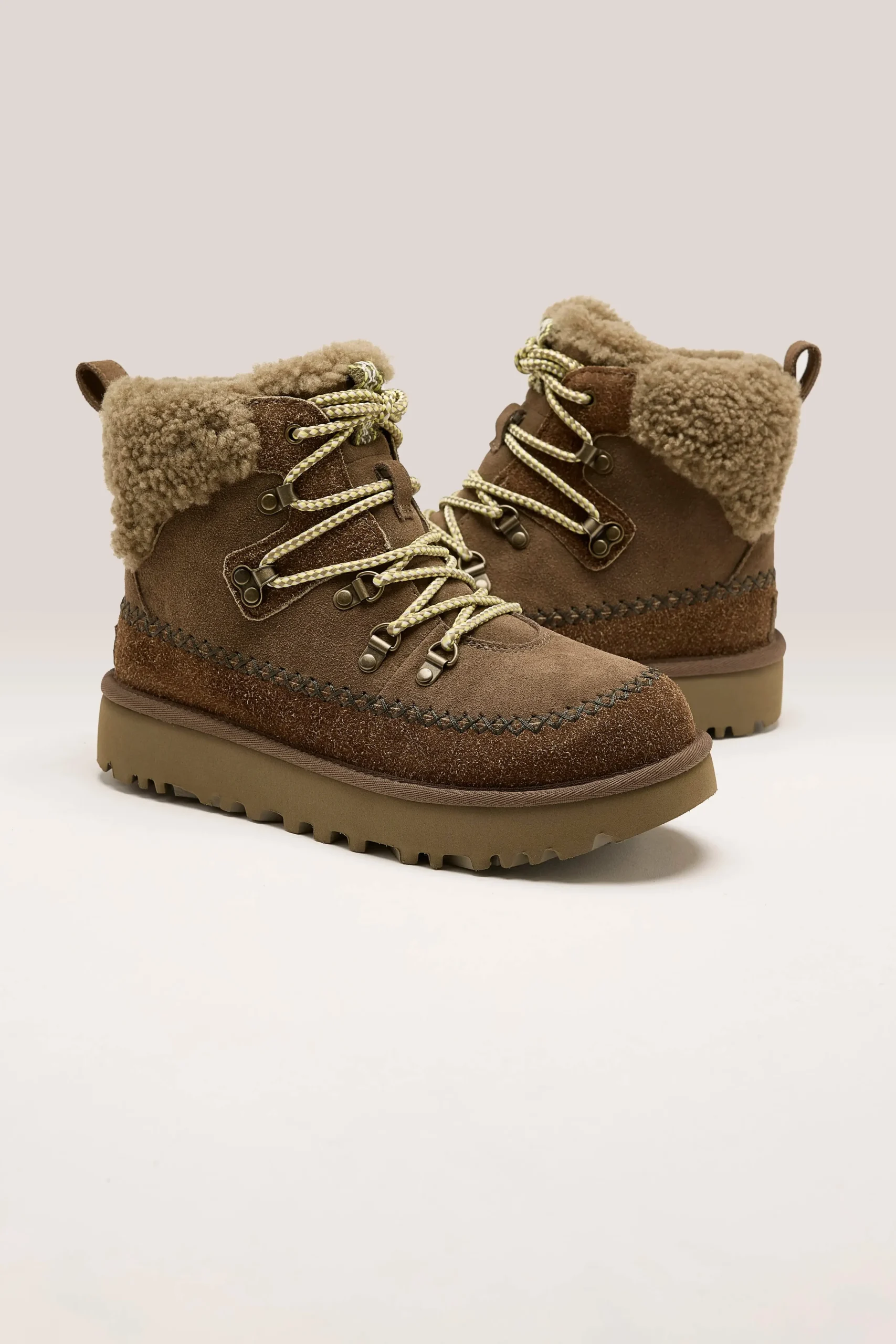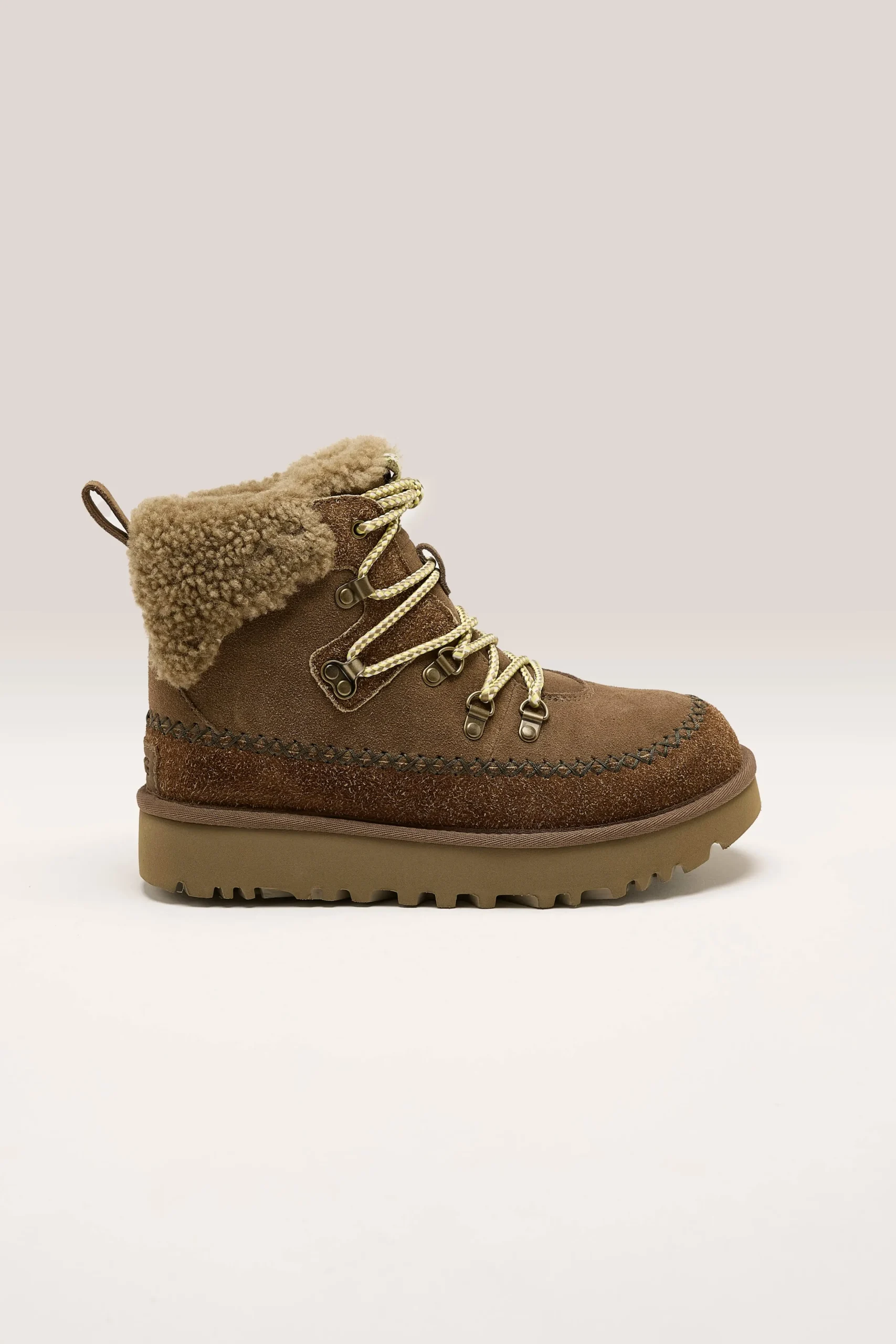 The Ugg Classic Alpine Lace-up boots feature a sheepskin collar, upcycled UGGplush lining, and smooth suede upper on a d…