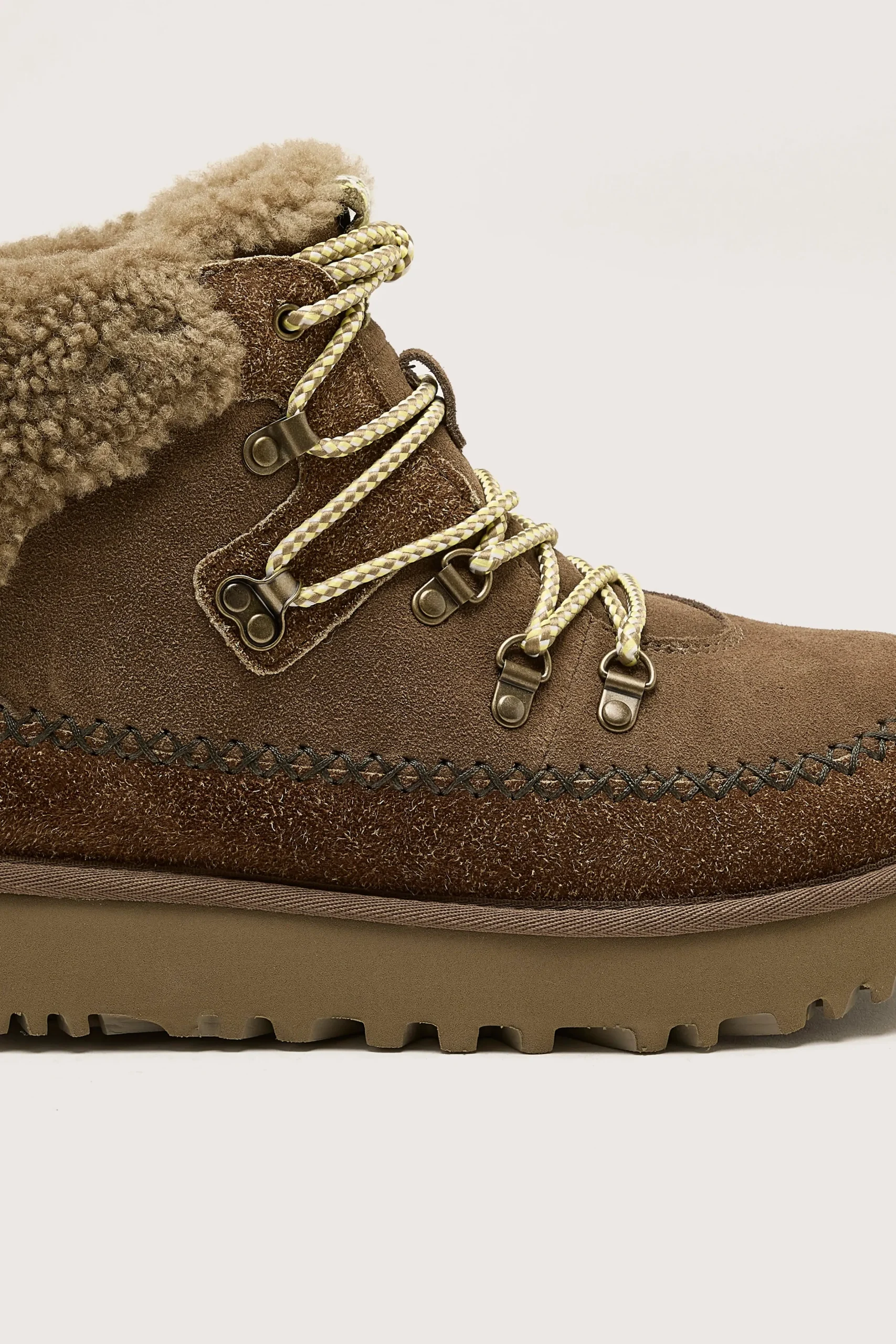 The Ugg Classic Alpine Lace-up boots feature a sheepskin collar, upcycled UGGplush lining, and smooth suede upper on a deep, lugged EVA outsole.