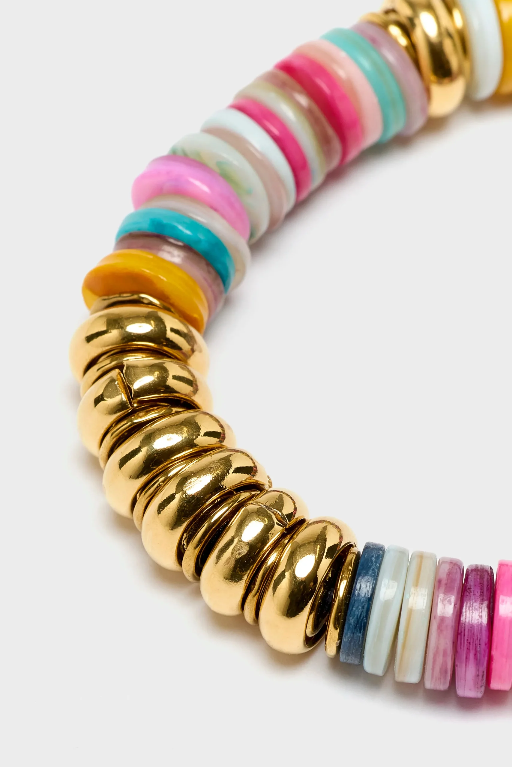 The Vadi Jewels Alicùdi bracelet features a vibrant combination of shell and gold-plated hematite beads on an elastic t…