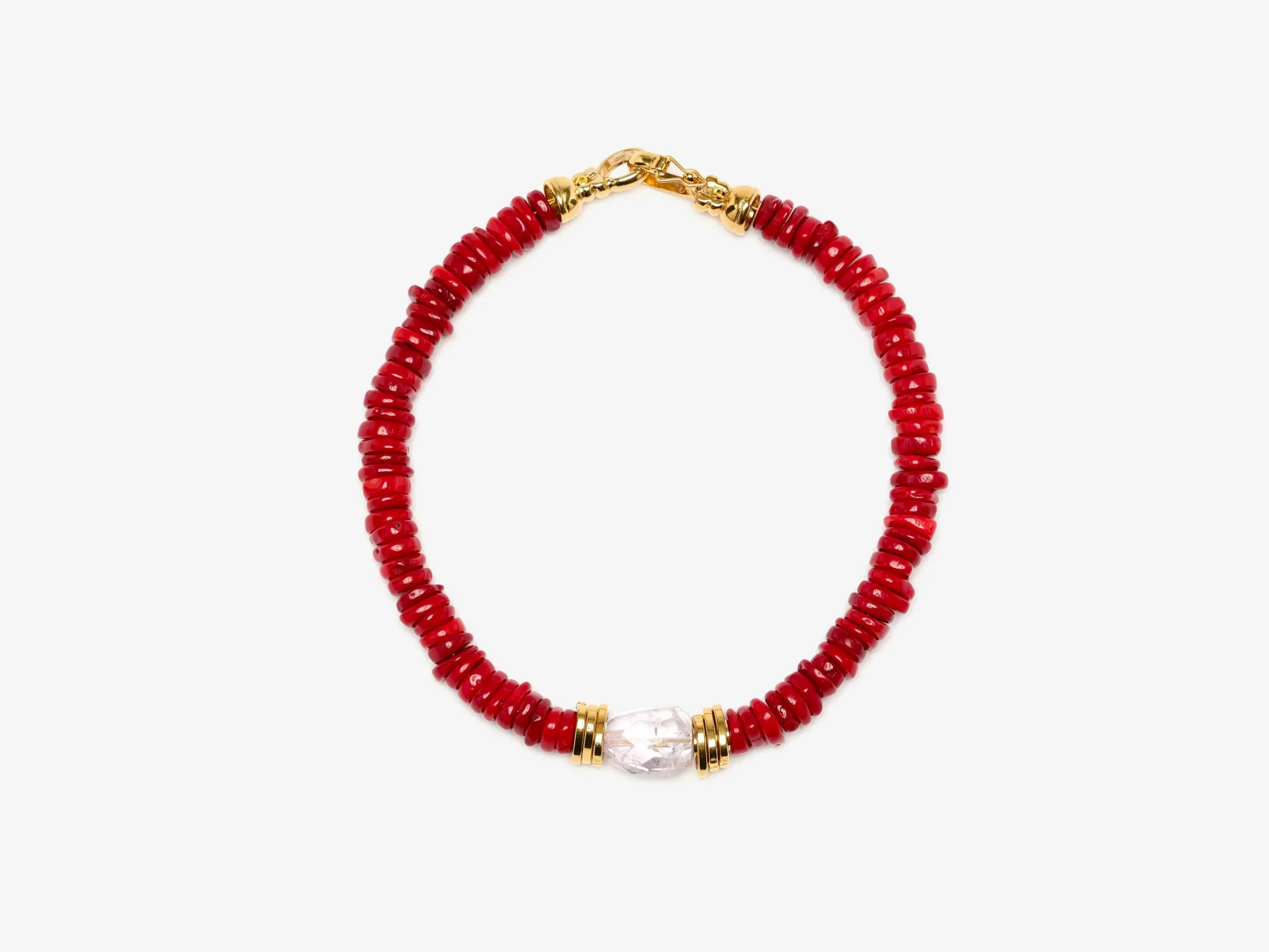 The Paloma necklace from Vadi Jewels features bold red gorgon coral beads, a centred amethyst stone, gilded bead accents…