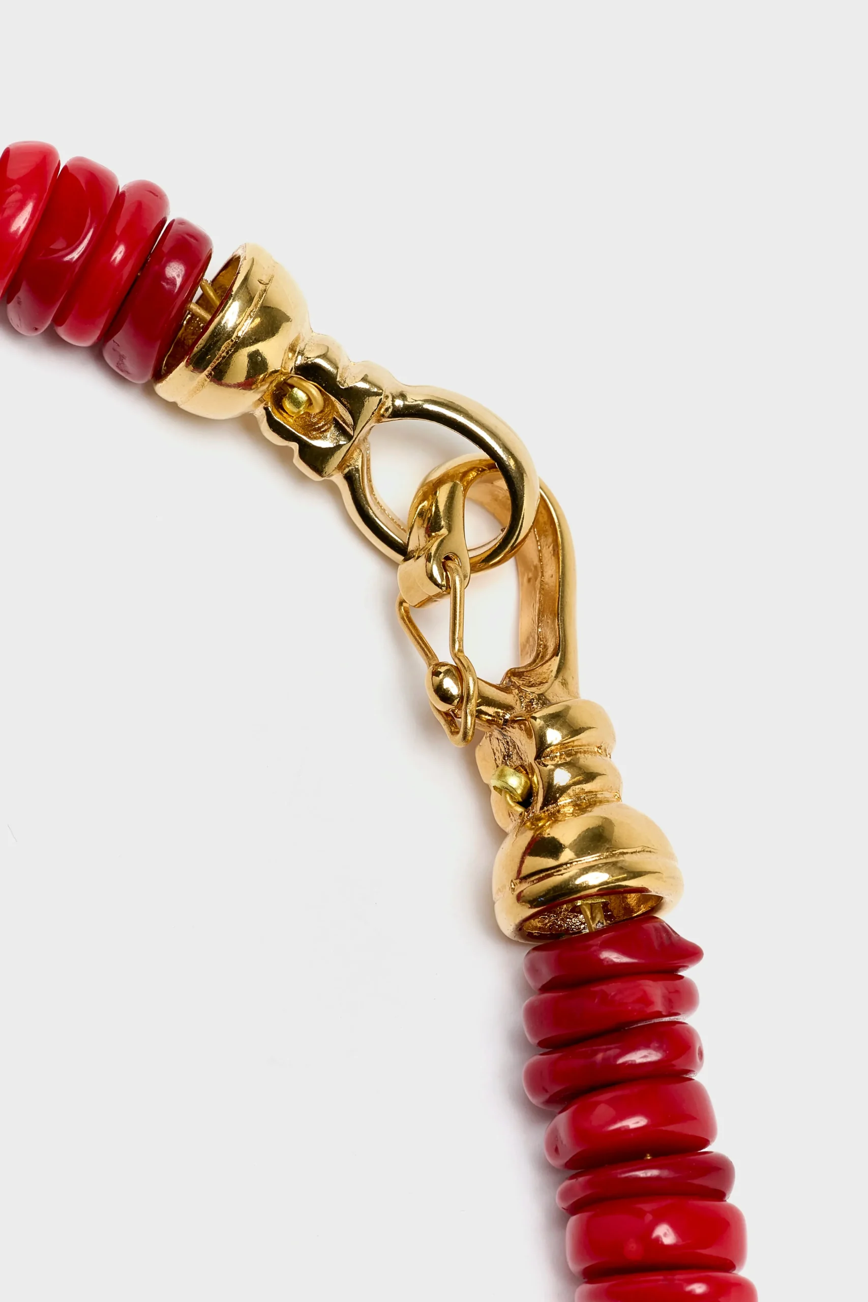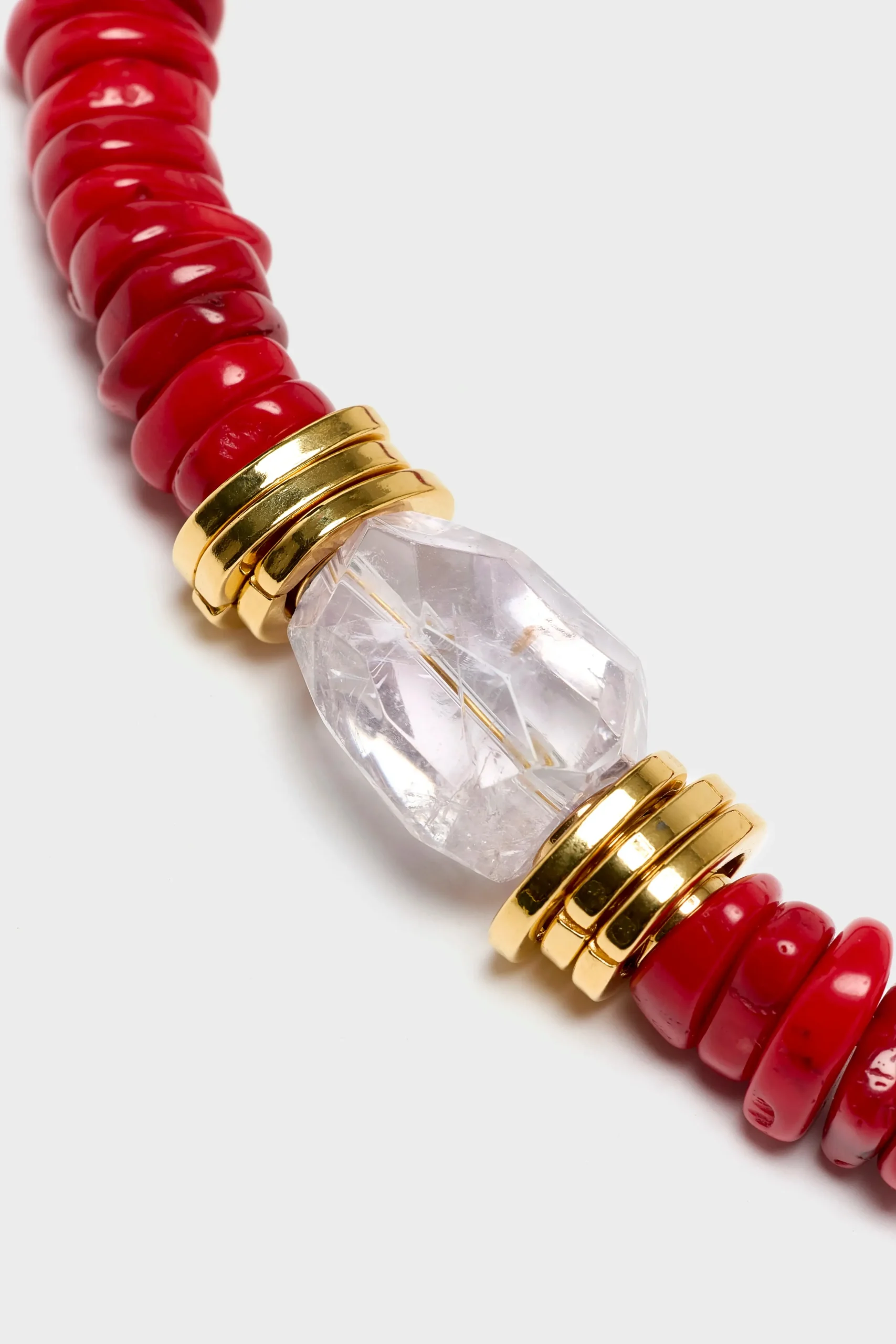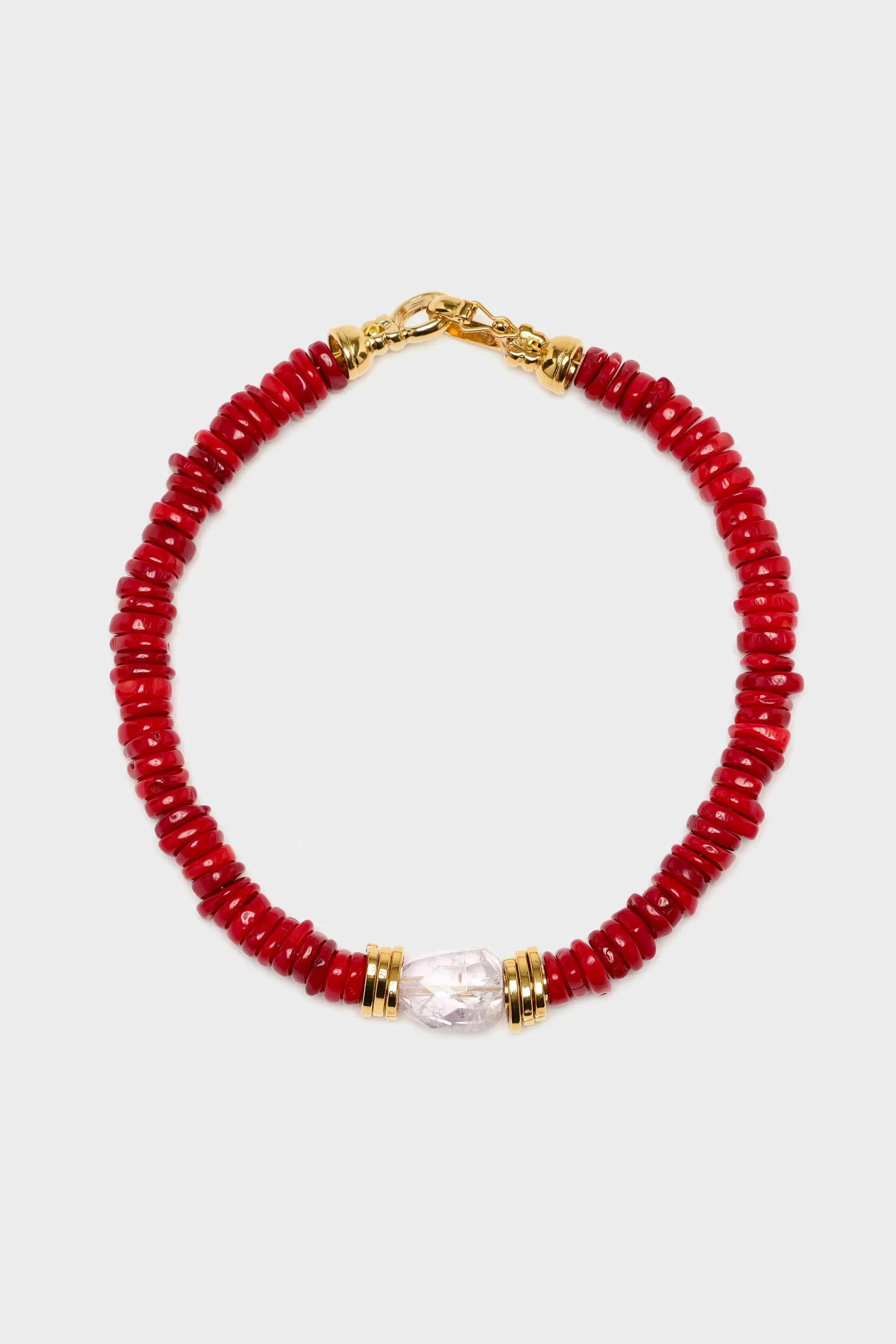 The Paloma necklace from Vadi Jewels features bold red gorgon coral beads, a centred amethyst stone, gilded bead accents, and a figure-eight safety clasp.
