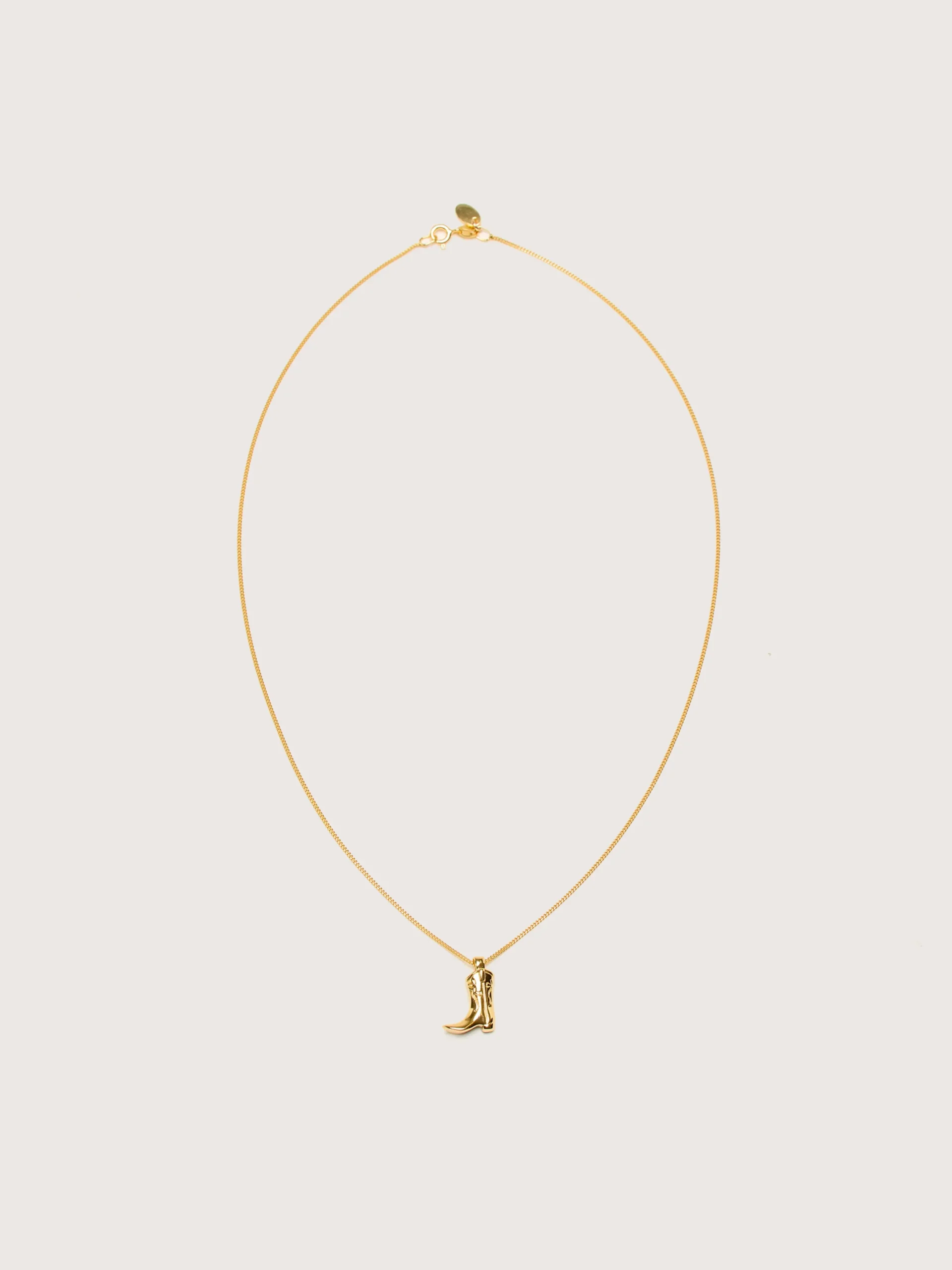 The Wolf Circus Cowboy Boot Charm Necklace has a small boot pendant on a gold-plated curb chain.